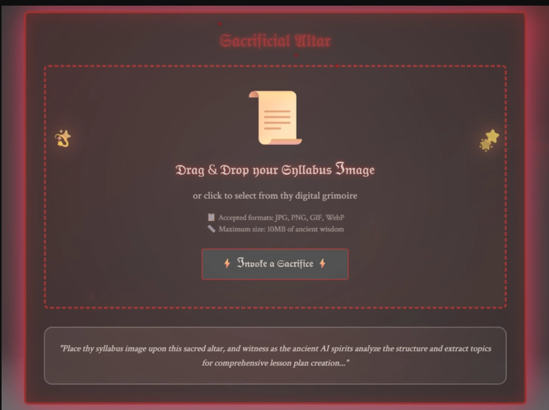 BloodBound Academy transforms a mundane syllabus into immersive learning experiences with retro vibes, and spooky & haunting themes. Students upload course documents and enter a haunted digital classroom where every interaction pulses with dark forces. Blood trails follow your cursor, ancient scrolls unfurl with course content, 14 layered audio effects create spine-tingling ambience, and visual effects like crawling spiders and lightning strikes respond to user actions. It's education reimagined as a gothic adventure.