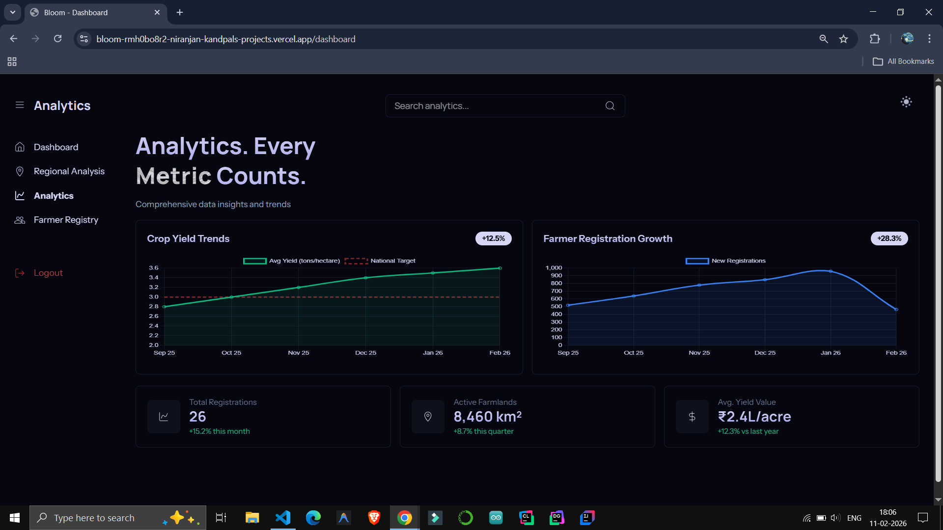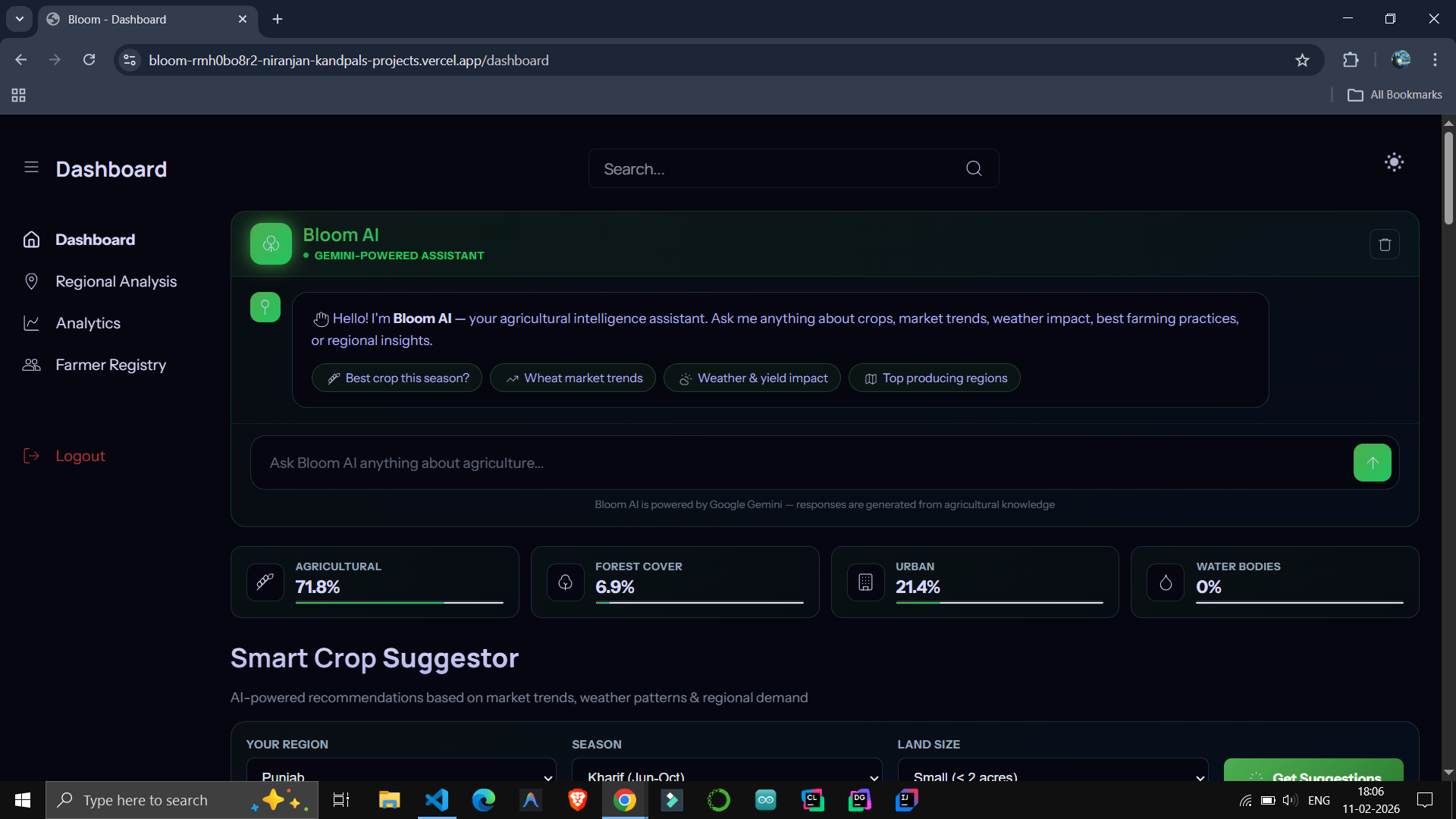 The spark for Bloom came from an unlikely place, I read about how hedge funds use satellite imagery to count shadows cast by floating lids on oil storage tanks, estimating global supply reserves before official reports are released. It hit me that Why is this "Eye in the Sky" technology reserved for profit? In World, price crashes often happen because farmers blindly plant what was profitable last year, leading to massive oversupply. So I realized we could apply that same logic using orbital imagery to calculate ground truth to solve a human problem of Food Security. Bloom bridges the gap, bringing high-tech market intelligence to the Indian agricultural sector.