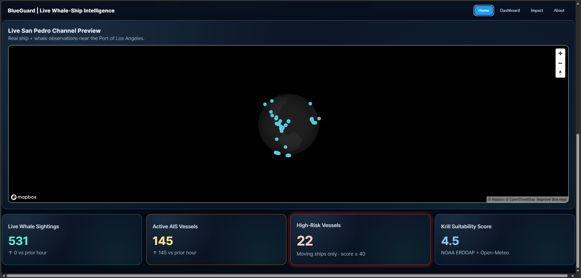 Whale–ship strikes sit at an uncomfortable intersection: endangered animals, billion-ton commerce, and routes drawn for fuel and time—not for biodiversity. Regulators and partners emphasize that slowing, shifting fairways, and better situational awareness can change outcomes. I built BlueGuard as a demo that answers a single operational question in a busy corridor (San Pedro / Port of Los Angeles): where are ships, where are whales, and where does risk concentrate right now?