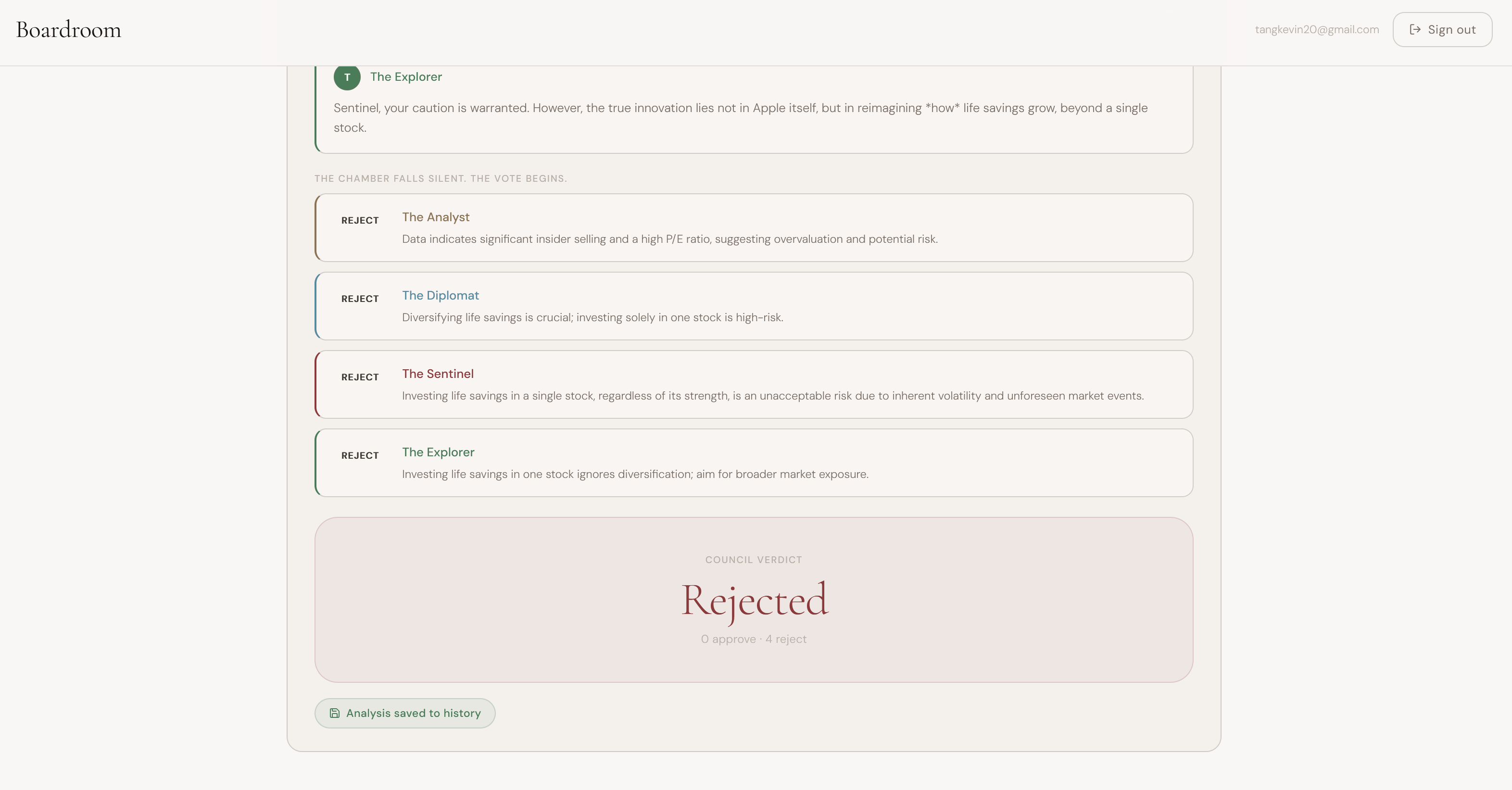 Boardroom takes a stock ticker and your investment question, then autonomously conducts a full research workflow. Our intelligent AI agent searches the web for real-time news, calls financial data APIs to pull price charts, technical indicators, fundamentals, financial statements, and insider transaction data, and writes a structured analysis report interleaved with generated charts, progress all streamed live to your screen. For yes/no questions, it then convenes a council of four specialized AI agents (a bull, a bear, a risk manager, and a fundamentals analyst) who debate the thesis out loud based on the research report and cast a vote to determine the final verdict.