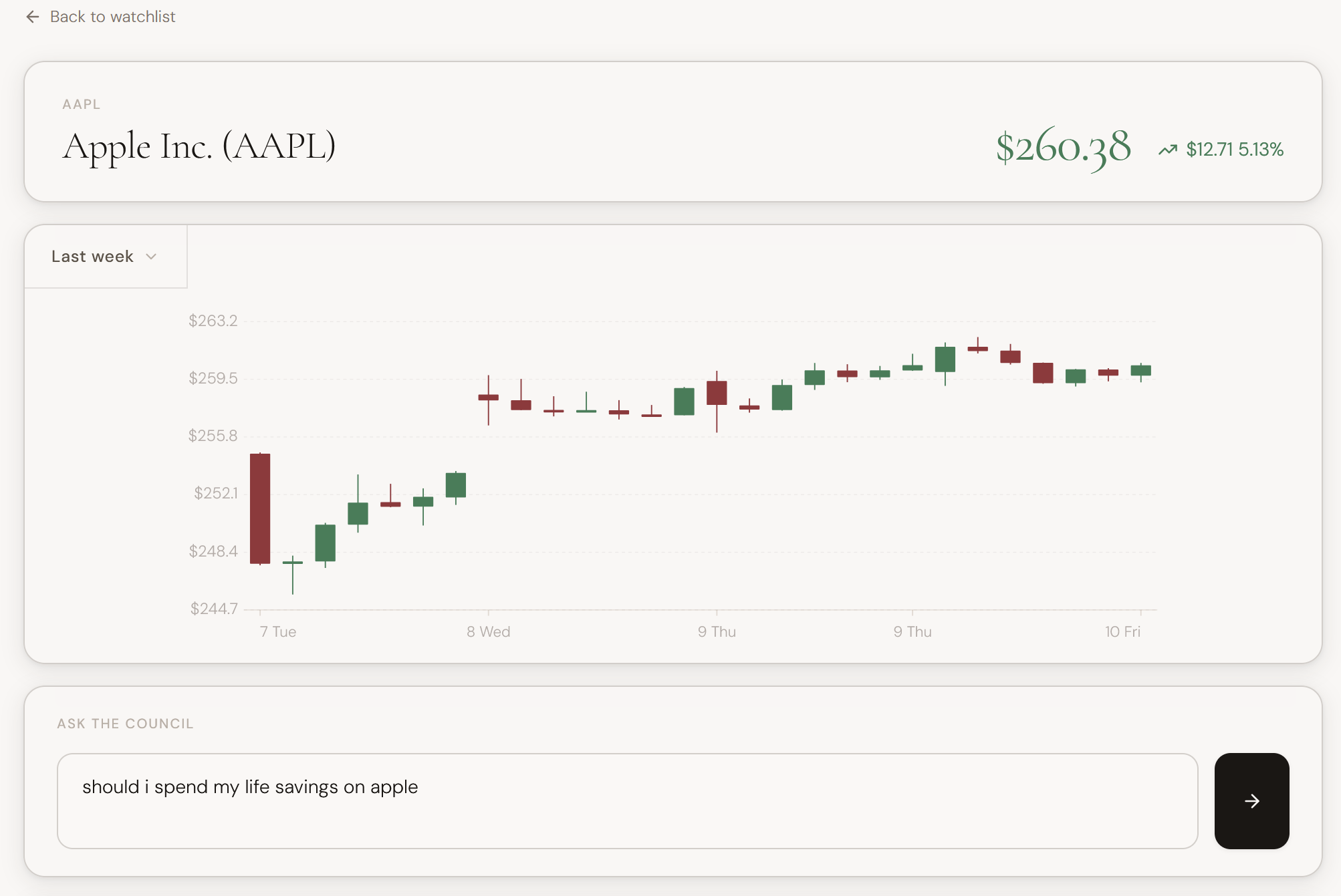 The backend is FastAPI with a PydanticAI agentic loop powered by the Gemini 2.5 Flash model. The agent has six tools: yfinance for charts and fundamentals, Finnhub for insider transactions and sentiment, and mplfinance for server-side chart rendering. The agent decides autonomously which to call and with what parameters, to best fit the user's needs. Results stream to the frontend via Server-Sent Events. The council is a separate multi-agent orchestration layer where each agent has a distinct persona and system prompt, with ElevenLabs TTS generating spoken audio for each argument. The frontend is React + Vite, with Supabase handling auth and persisting analysis history.
