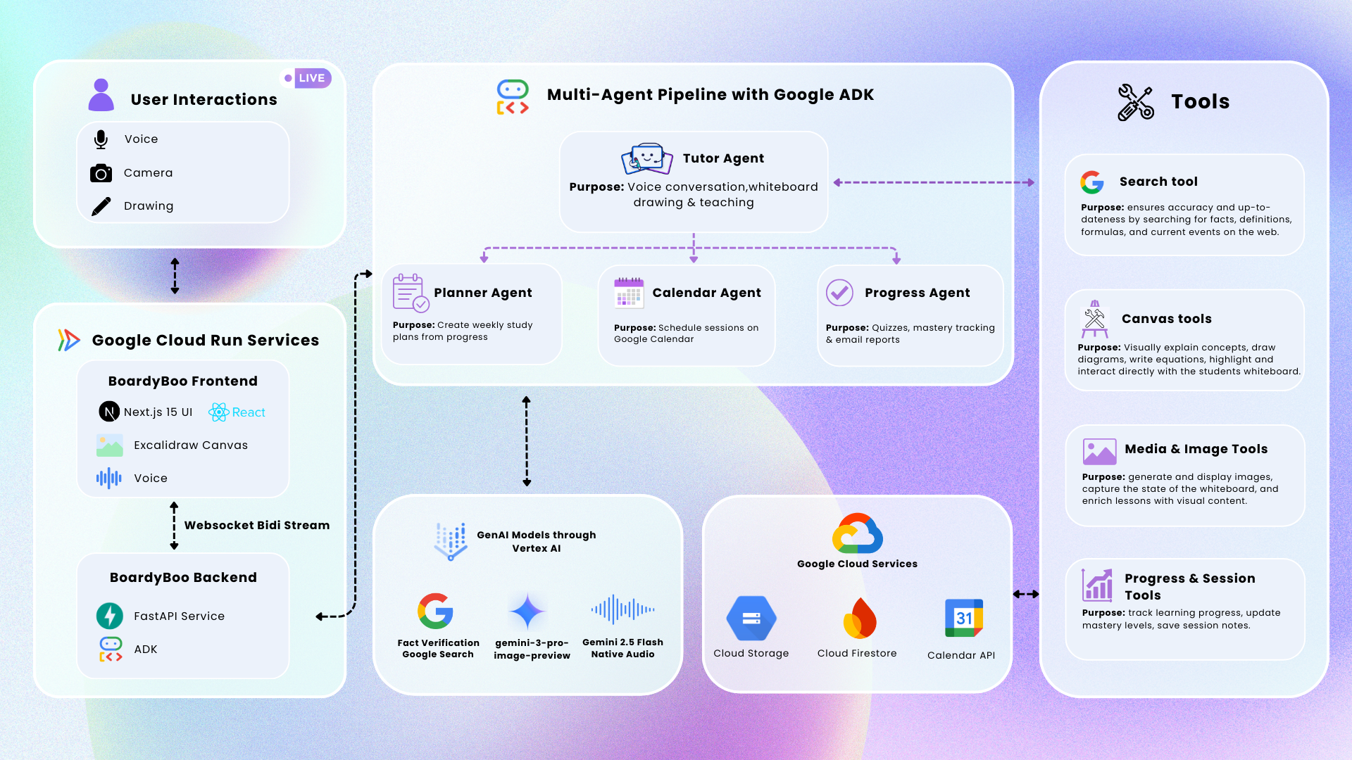 - 🧠 Context-Aware Memory: BoardyBoo remembers past sessions. Using Firestore, the Tutor Agent retrieves the student's historical mastery levels at the start of the session, making the "Live" experience deeply personalized rather than disjointed and turn-based.