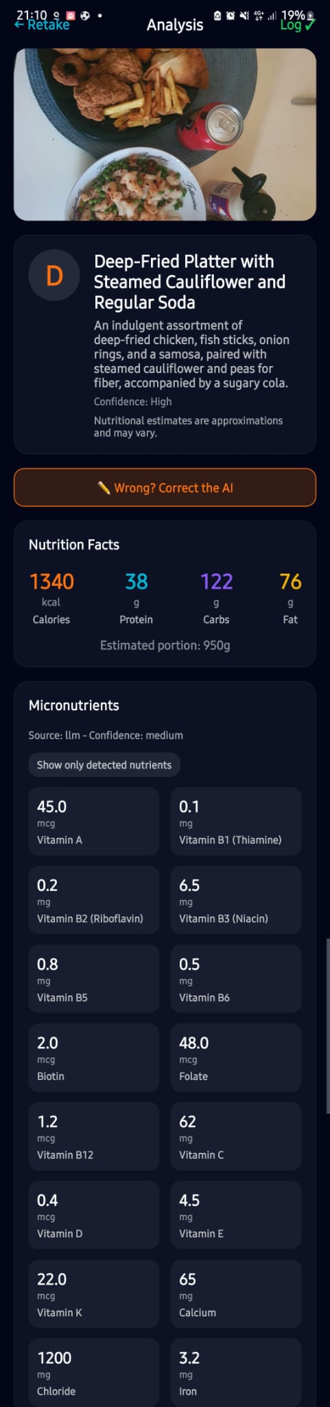 the food analyzer showing the carloier and most all of the vitamine and minerals