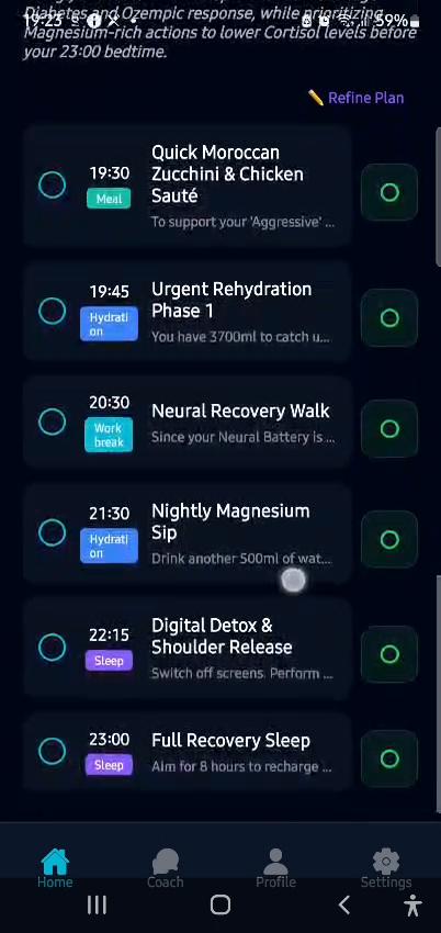 It reads real life, builds the easiest strong plan the user can actually follow, watches reality hit that plan, and rebuilds it in real time.