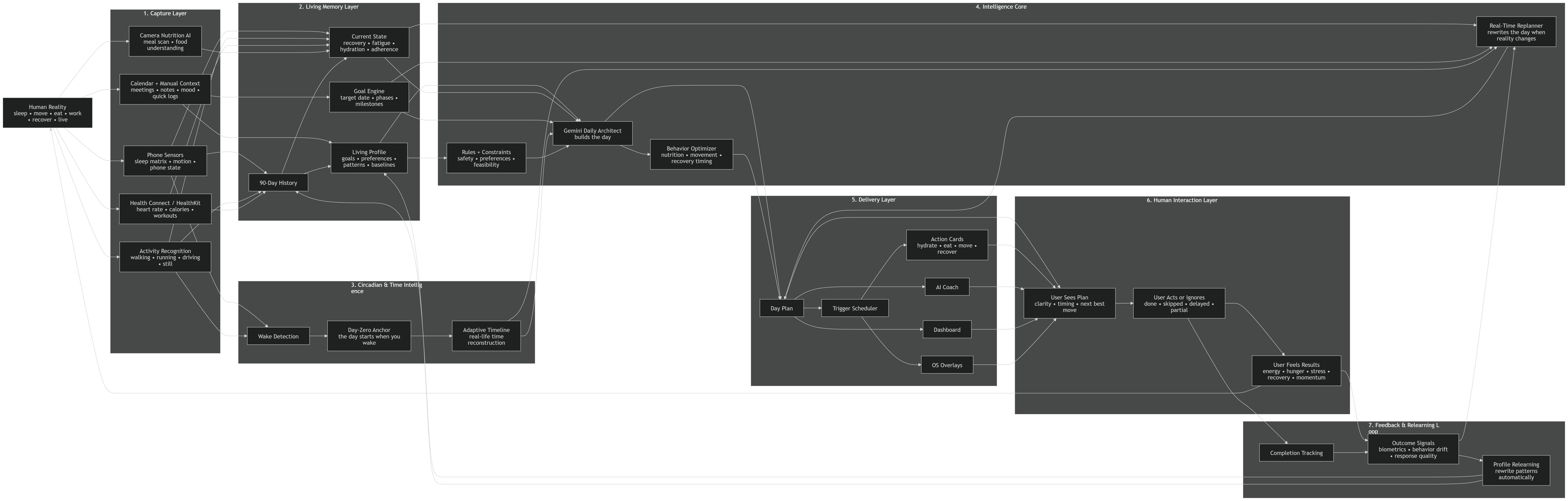 $$ \text{Human Reality} \rightarrow \text{Capture} \rightarrow \text{Memory} \rightarrow \text{Gemini Planning} \rightarrow \text{Delivery} \rightarrow \text{User Response} \rightarrow \text{Relearning} \rightarrow \text{Better Next Action} $$
