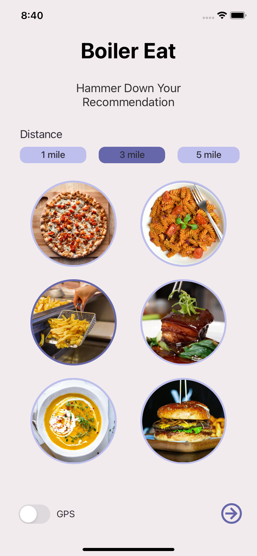 Boiler Eat will take in current location through GPS or an address manually typed to search restaurants near the user. The recommendation will be based on the type of food and the radius the user wants. After the user was recommended with a first restaurant and is not happy with it, the user can ask for another recommendation by simply clicking the "hammer" button. Boiler Eat will keep giving new recommendations until there are no more restaurants.