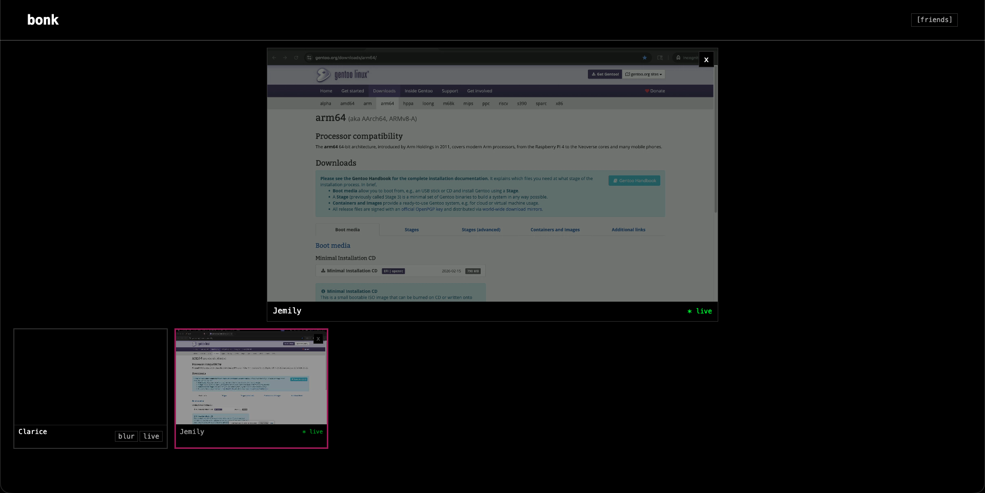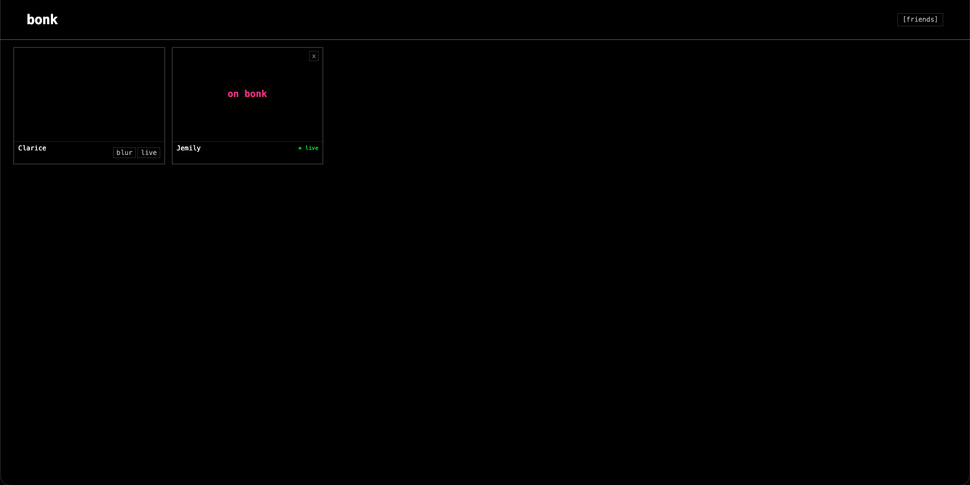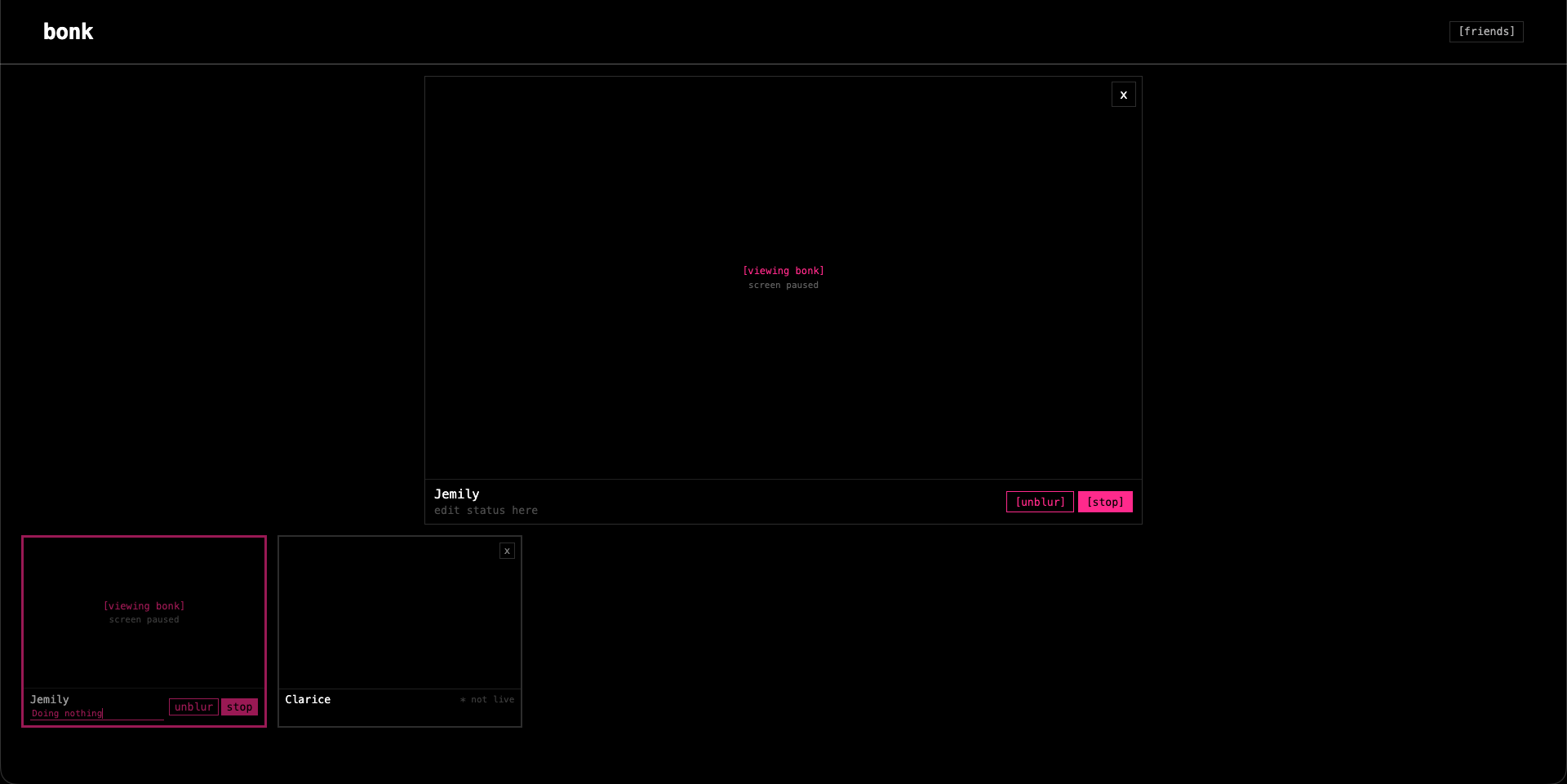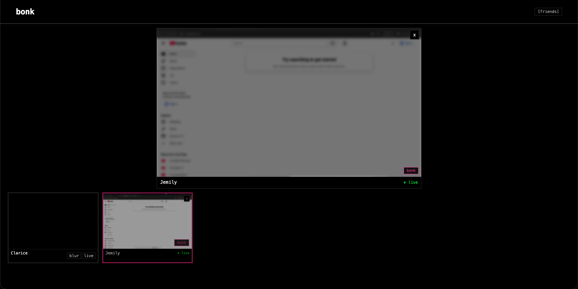 We realized that if multiple people shared their screens while viewing the grid, there would exist an infinite mirror of screens across everyone on the website. This may be distracting and unideal to look at. After looking into platforms like Zoom and Twitch, we noted that their screen previews were static and limited viewing to one screen at a time. Ultimately, we implemented a check of if a user was viewing Bonk and was sharing their screen, their screen would no longer show their live activity, but that they're on the Bonk website.
