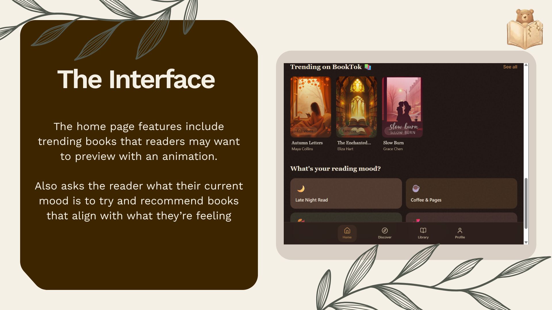 - A search bar where users can type in book names and AI uses external sources to generate an animation based on summaries, themes, and reviews
