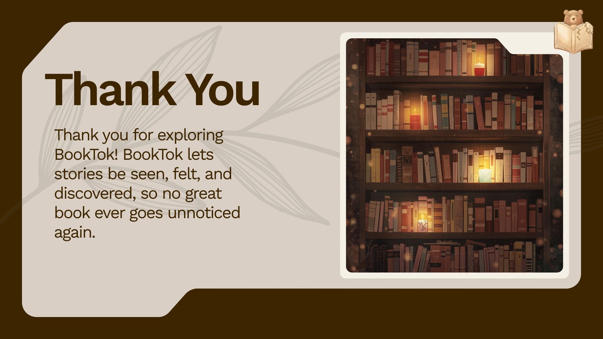 Currently, short-form platforms such as TikTok are trending for their ability to engage viewers with content. BookTok aims to bridge the gap between books and short-form entertainment by using AI to generate animations based on a book’s synopsis, reviews, and author input. Through creating short-form content that is easily accessible to readers, BookTok helps readers discover new stories and allow authors to overcome the challenges of being discovered.