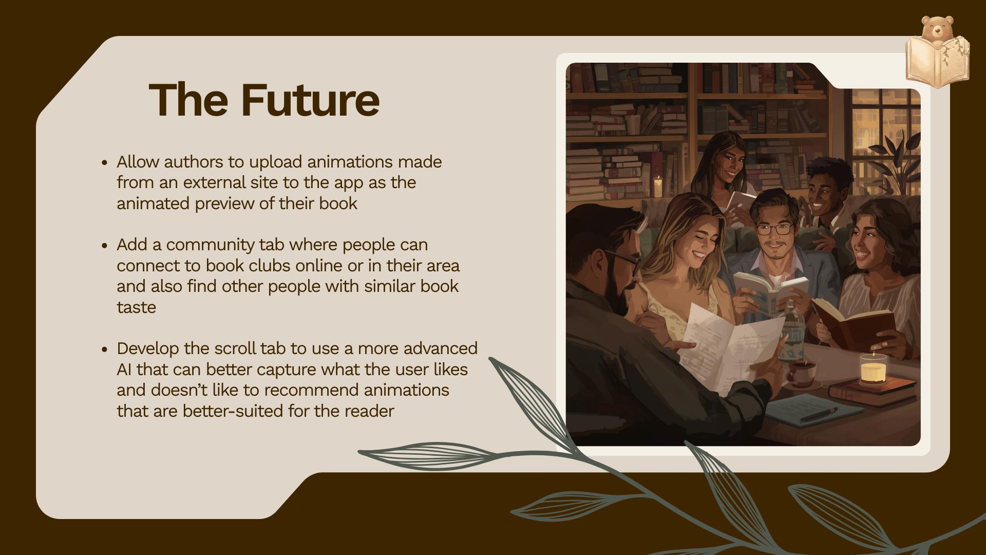 - Add a community tab where people can connect to book clubs online or in their area and also find other people with similar book taste