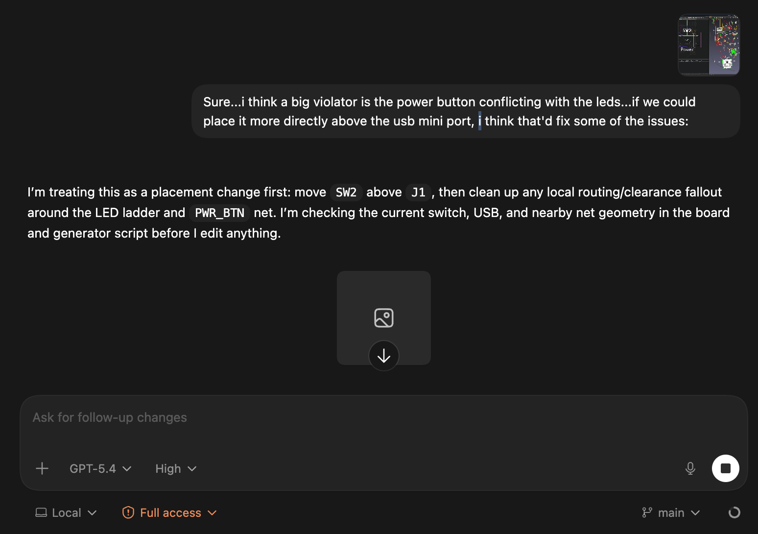 Agents Can Accelerate the PCB Design and EDA Process Leveraging programmatic EDA tools such as electrical rule checkers (ERC) and design rule checkers (DRC), Codex was able to iteratively design & implement key aspects of a PCB design project including design specification, component selection, electrical schematic generation, copper routing including vias, placements, and drill guides to wire everything up on the board. As tempting as it would be to say Codex "one-shotted" this, in reality, there was a ton of back and forth between me and the model. With all things AI, your mileage may vary, but I suspect a seasoned circuit designer using a similar approach would be able to take this even further.