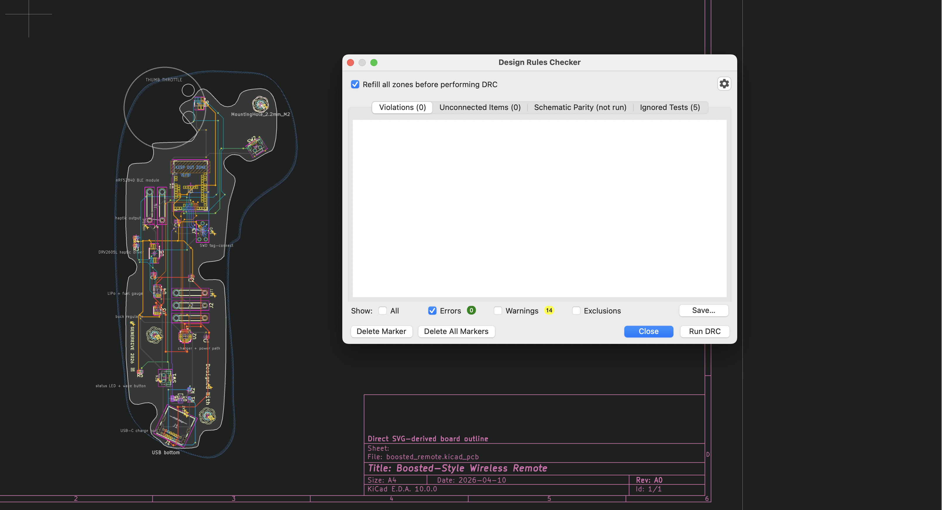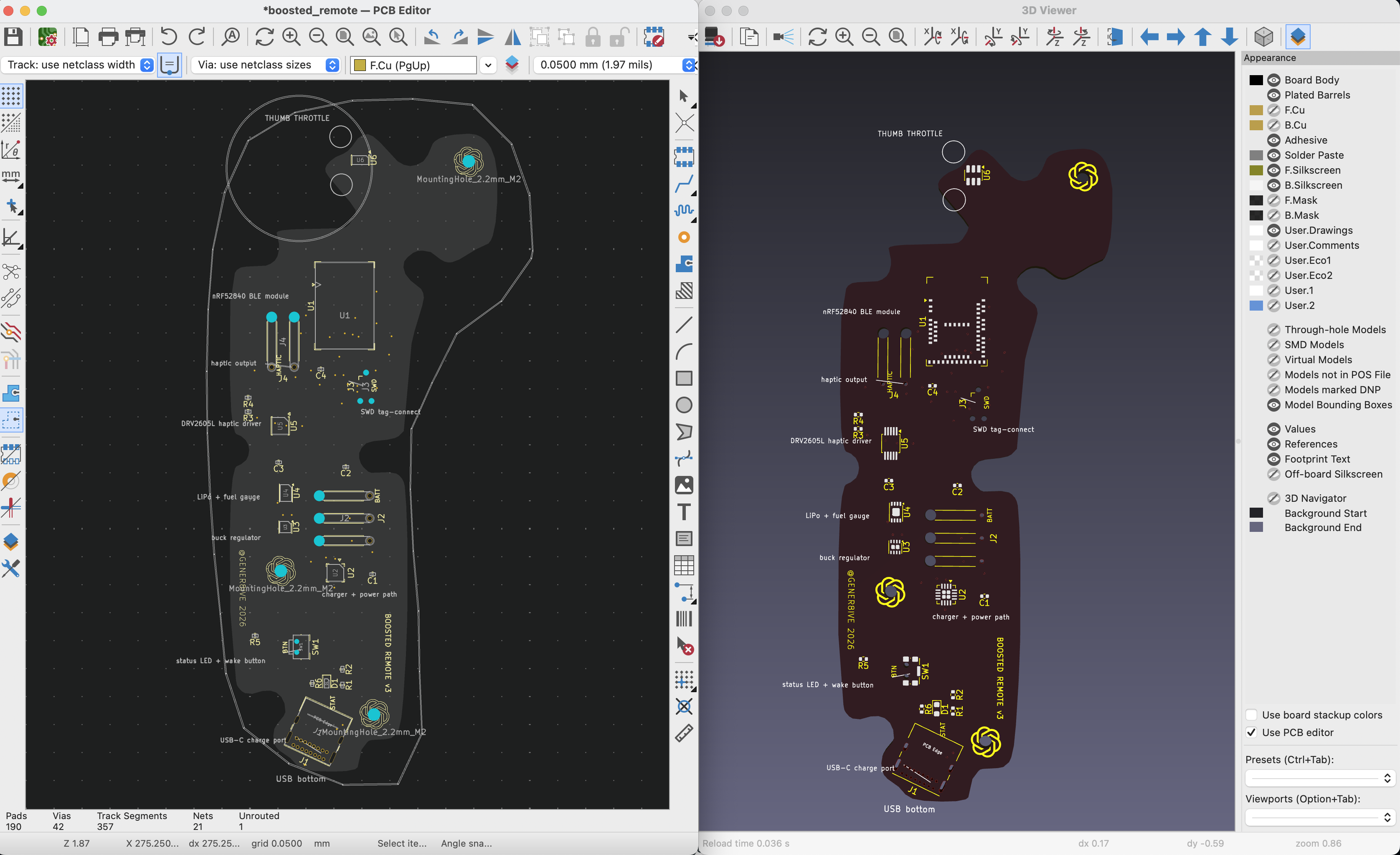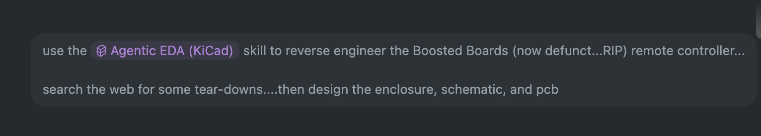 In this write-up, I'll show how that intuition proved to be unreasonably effective. The focus is the Boosted Boards remote, but the concepts of how to use coding agents for electrical (and mechanical) design should be generally applicable.