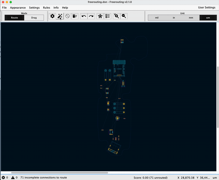 Similar to the electrical rule checker loop for our schematic, I ran the design rule checker (DRC) in a loop to iteratively flag and fix design rule violations. I instructed Codex to repeat the loop until there were zero errors or it hits a wall and needs me to manually route or place components. (Screenshot below is of me pointing & clicking inside the Freerouting UI, but Codex can run this in a terminal inside its agent loop then inspect and iterate on its errors).