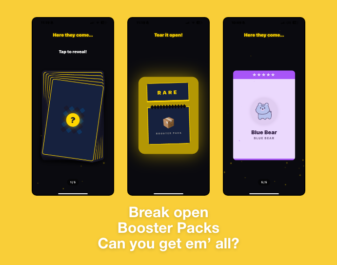 Booster Pets is a playful mobile game that lets users open digital booster packs to collect virtual pets of different rarities. Instead of paying to open packs, players perform simple real-world actions such as: