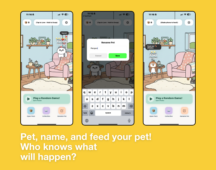 - Smiling into the camera Each action triggers a pack-opening animation, that reveals the virtual pet cards. The pets vary in rarity and visual effects, mimicking the thrill of opening real booster packs.