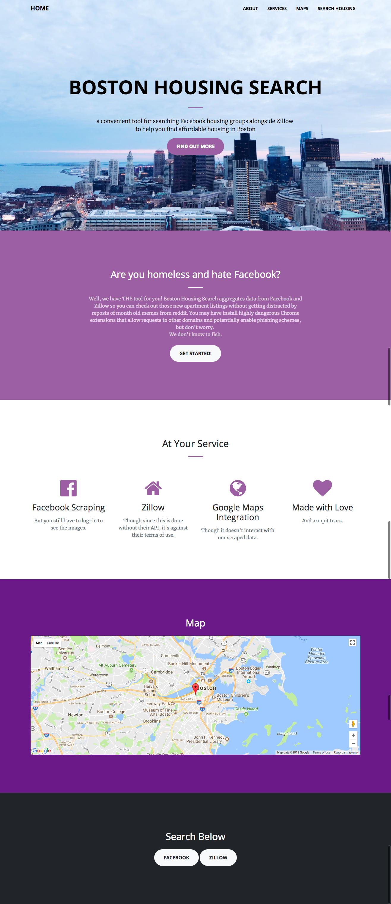 Well, we have THE tool for you! Boston Housing Search aggregates data from Facebook and Zillow so you can check out those new apartment listings without getting distracted by reposts of month old memes from reddit. You may have install highly dangerous Chrome extensions that allow requests to other domains and potentially enable phishing schemes, but don’t worry. We don’t know to fish.