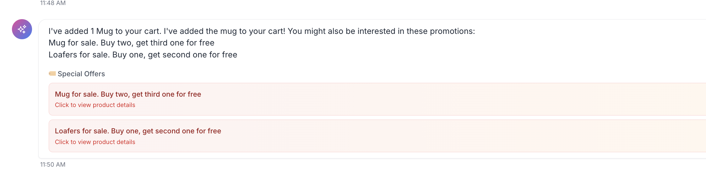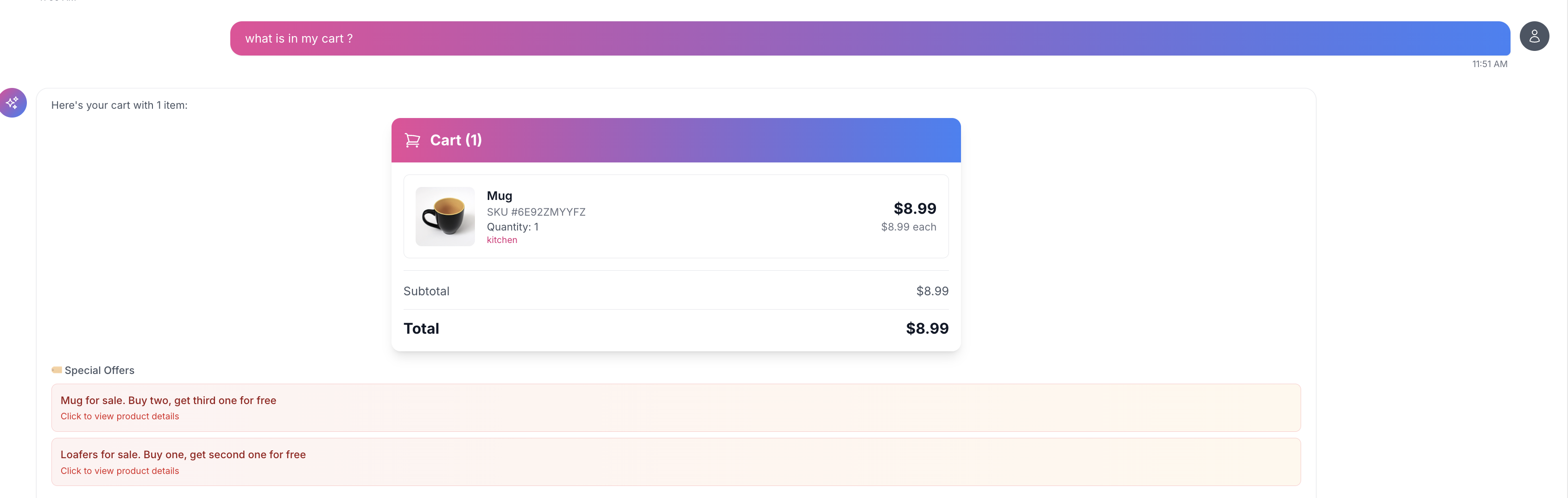 - Search products naturally: "Find me some sunglasses" returns beautiful visual product cards