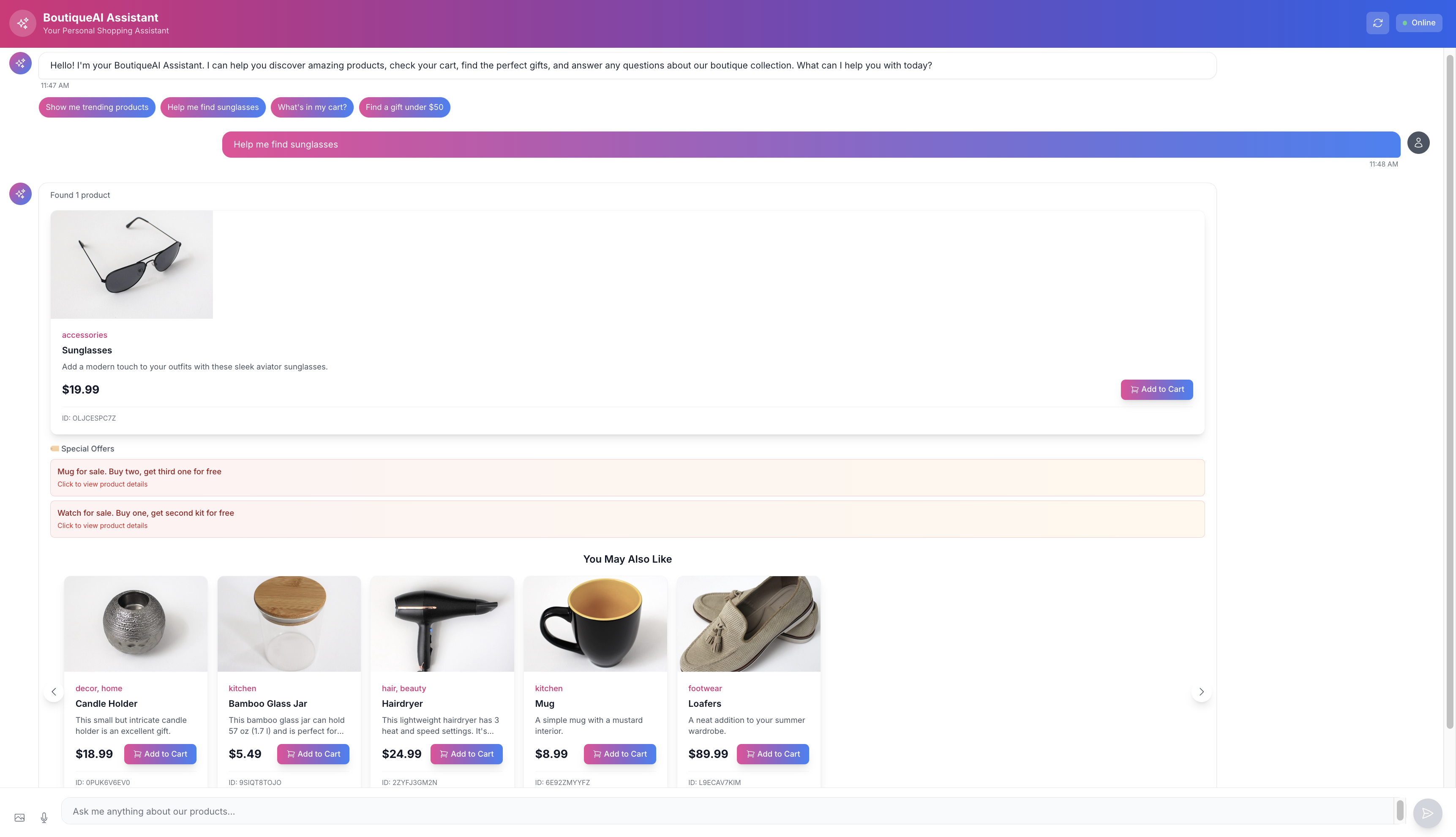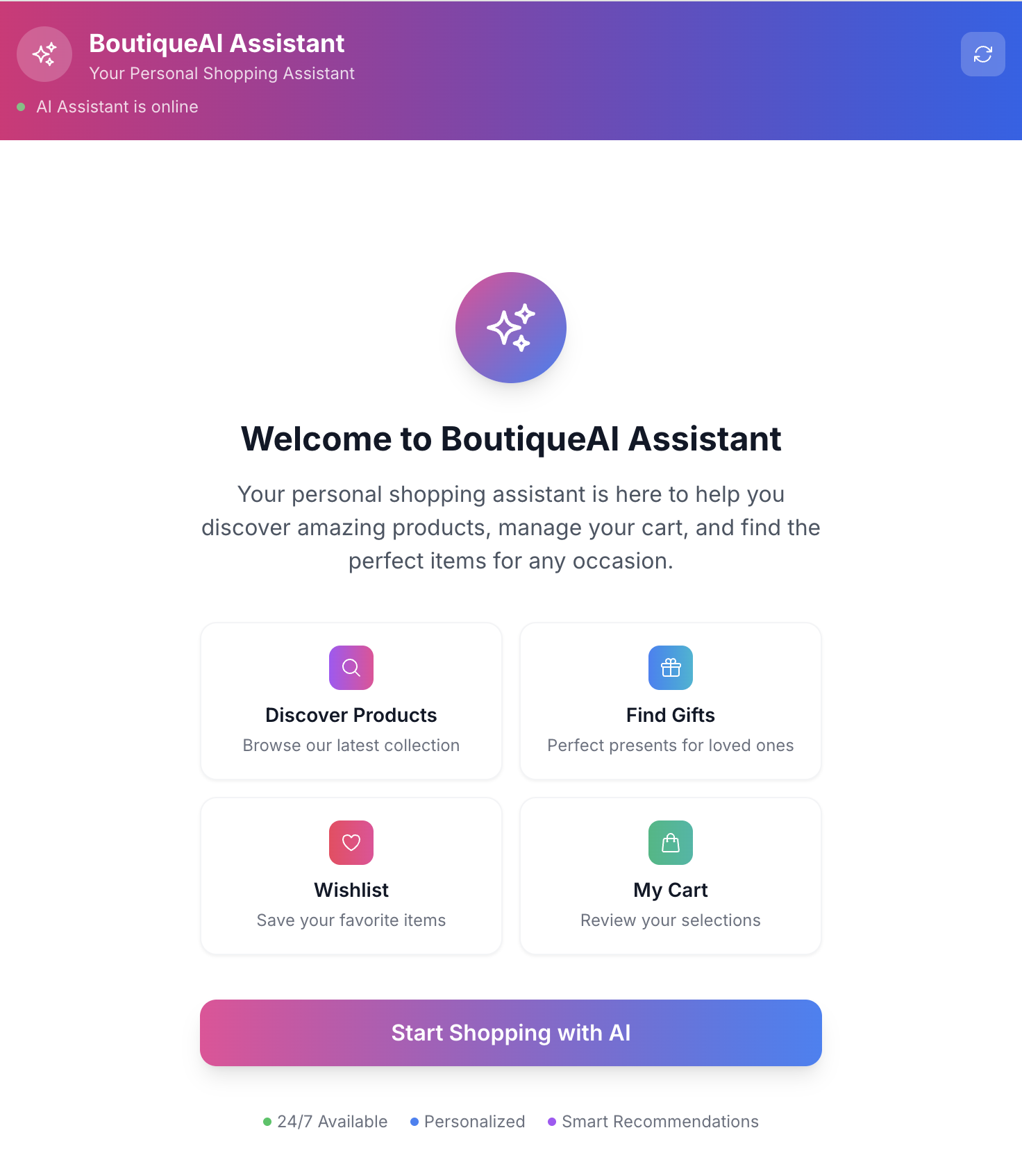 BoutiqueAI Assistant is an AI e-commerce chat interface that transforms online shopping into a natural conversation. Users can: