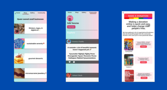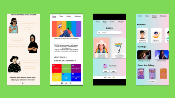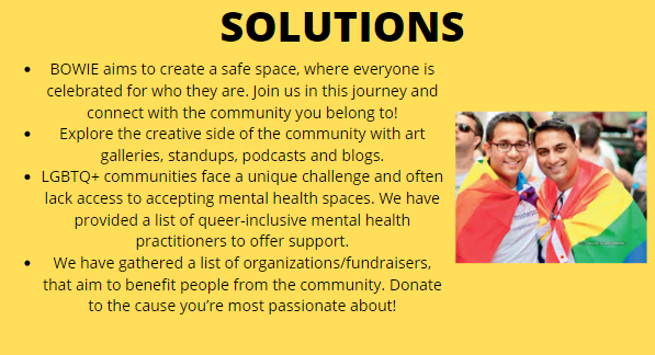 BOWIE aims to create a safe space, where everyone is celebrated for who they are. We have created different sections that connects people to ongoing fundraisers, queer owned small businesses, educational podcasts, standups, activists - a platform that brings about digital activism in a world constrained by the pandemic. We also showcased blogs and art by queer people that brings about a ray of hope in the community.