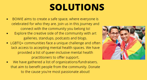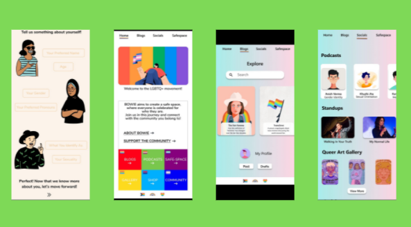 BOWIE aims to create a safe space, where everyone is celebrated for who they are. We have created different sections that connects people to ongoing fundraisers, queer owned small businesses, educational podcasts, standups, activists - a platform that brings about digital activism in a world constrained by the pandemic. We also showcased blogs and art by queer people that brings about a ray of hope in the community.