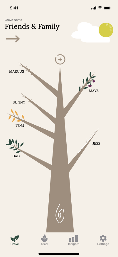 Making data feel human, not clinical. Every tracker we looked at turns relationships into numbers and scores. We had to fight that instinct constantly. The breakthrough was committing to never showing a number on the main Grove screen — only visual, organic states.