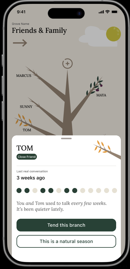 - 🌳 The Grove — a living tree visualization of your entire relationship ecosystem, glanceable and beautiful, with four branch states: Healthy, Fading, Bare, and Dormant