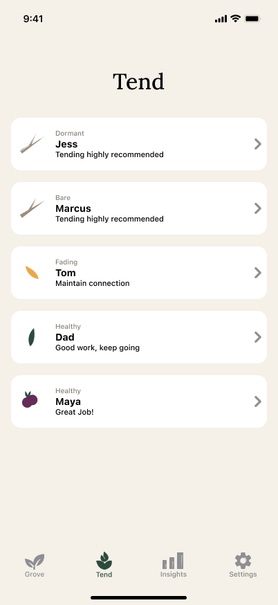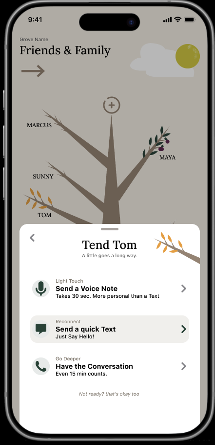 - 🌿 Tending— tiered micro-action suggestions ranked by effort: send a voice note, a quick text, or have the deeper conversation