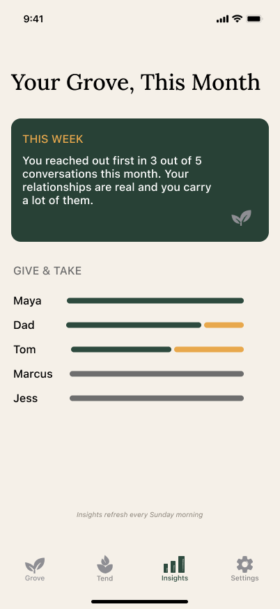 - The Give & Take visualization in Insights — representing reciprocity as two bars rather than a percentage, keeping it human and non-clinical