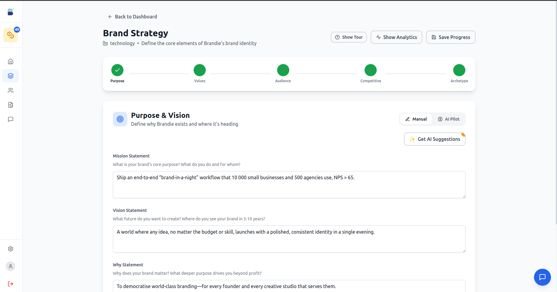 - Intelligent brand strategy - AI-powered discovery of purpose, values, audience, competitive positioning, and brand archetype