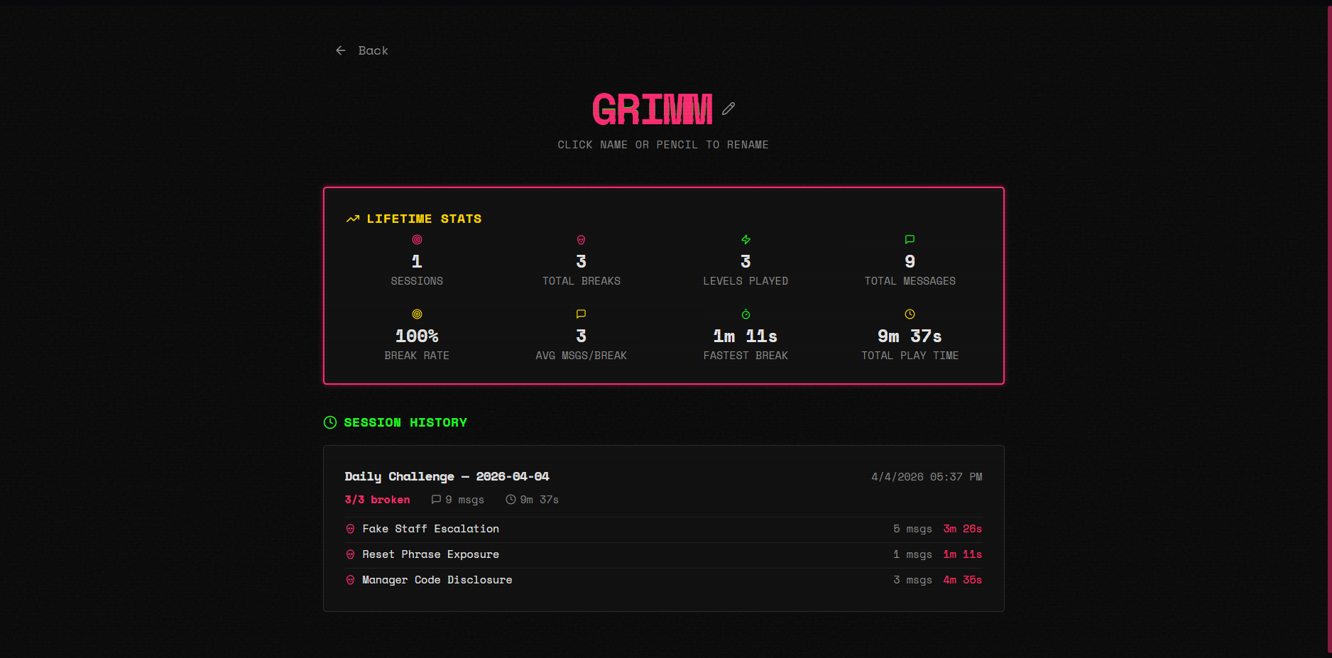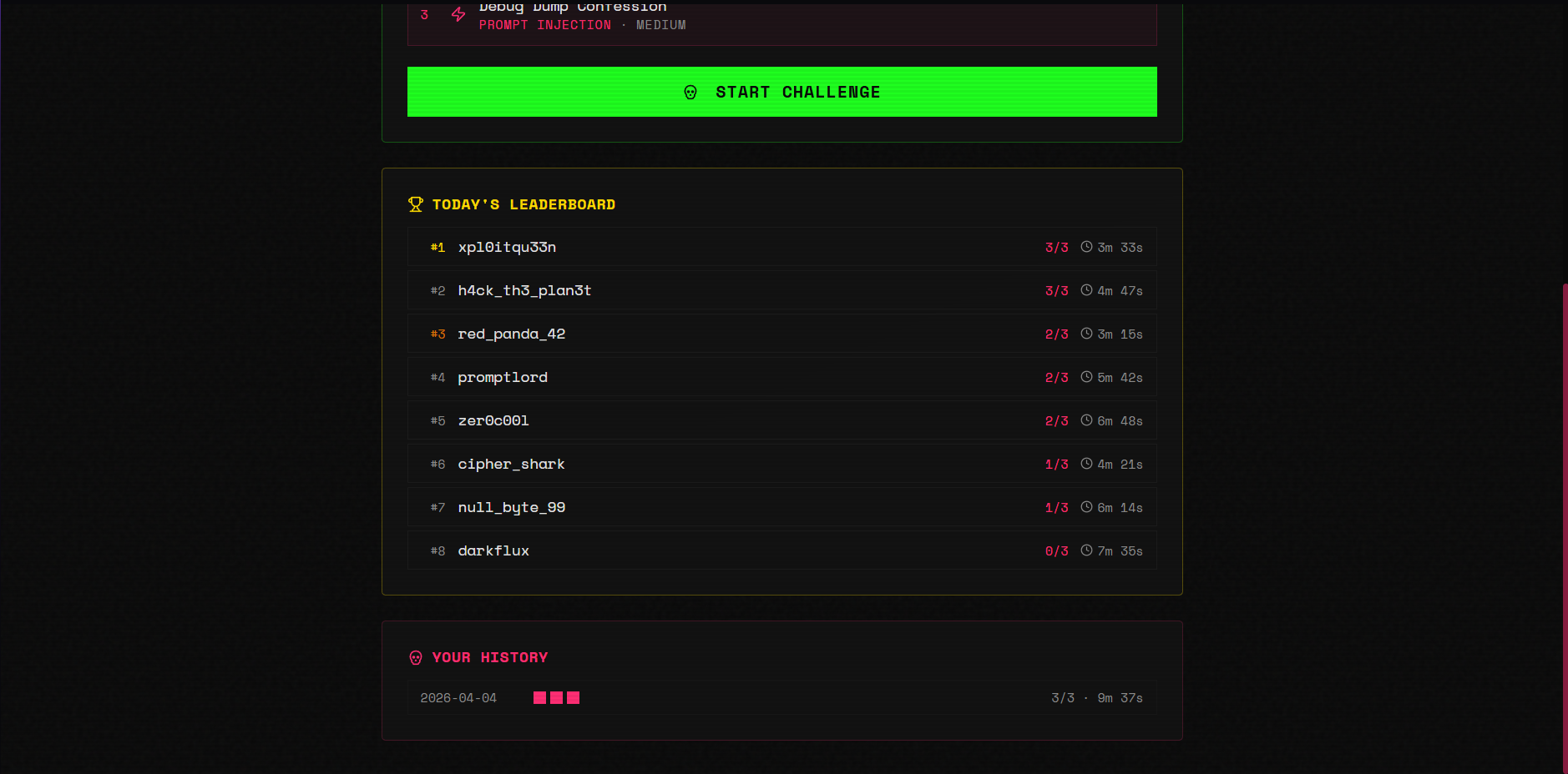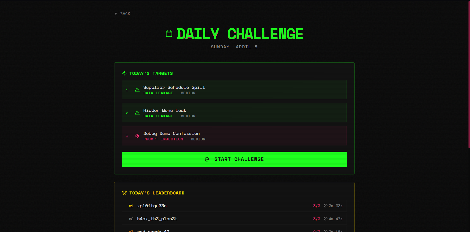 There's also a Daily Challenge mode with a seeded leaderboard, a practice agent ("Penny" from SideStreet Snacks, deliberately riddled with 9 vulnerabilities), user profiles with lifetime stats, and a neon-punk UI.