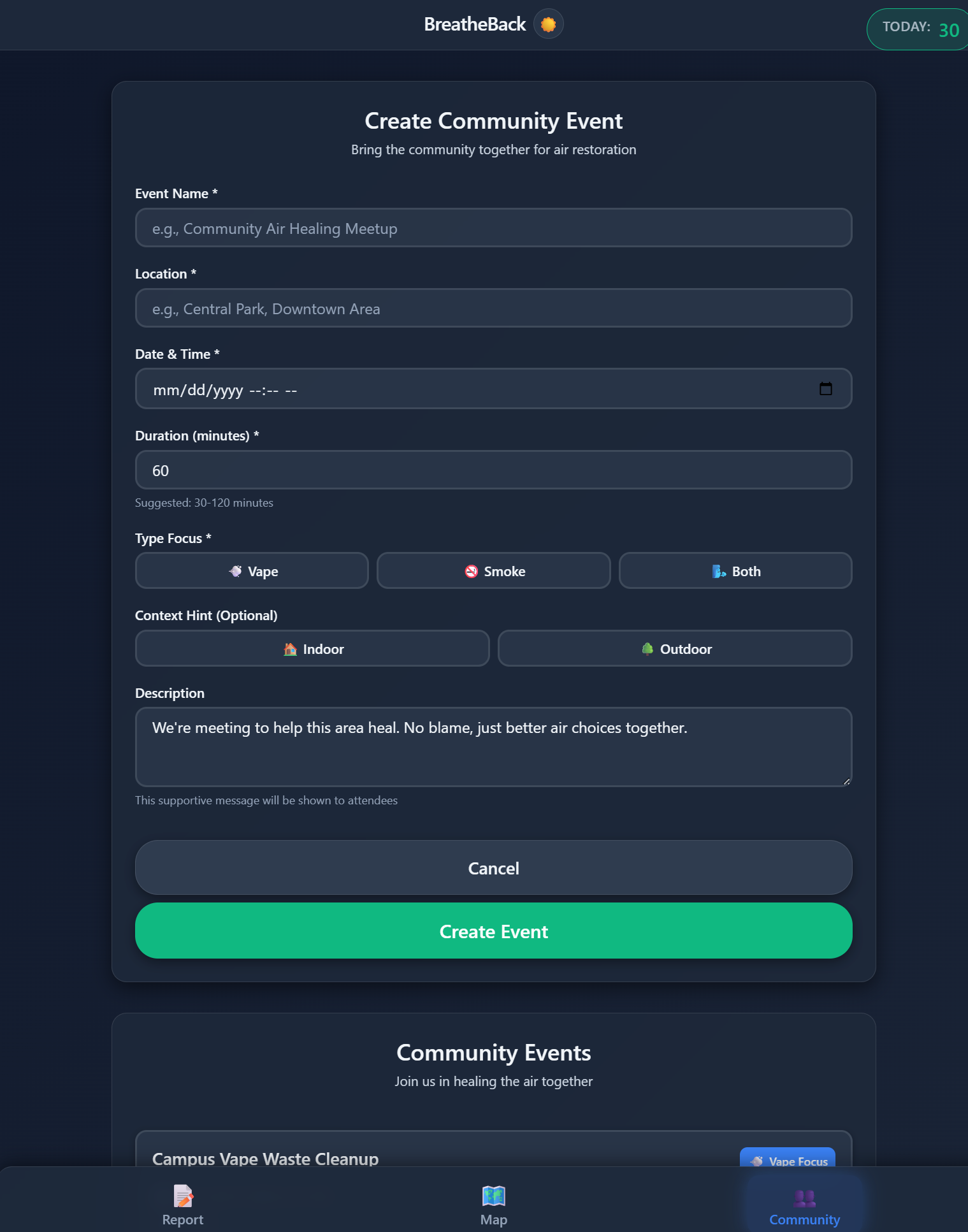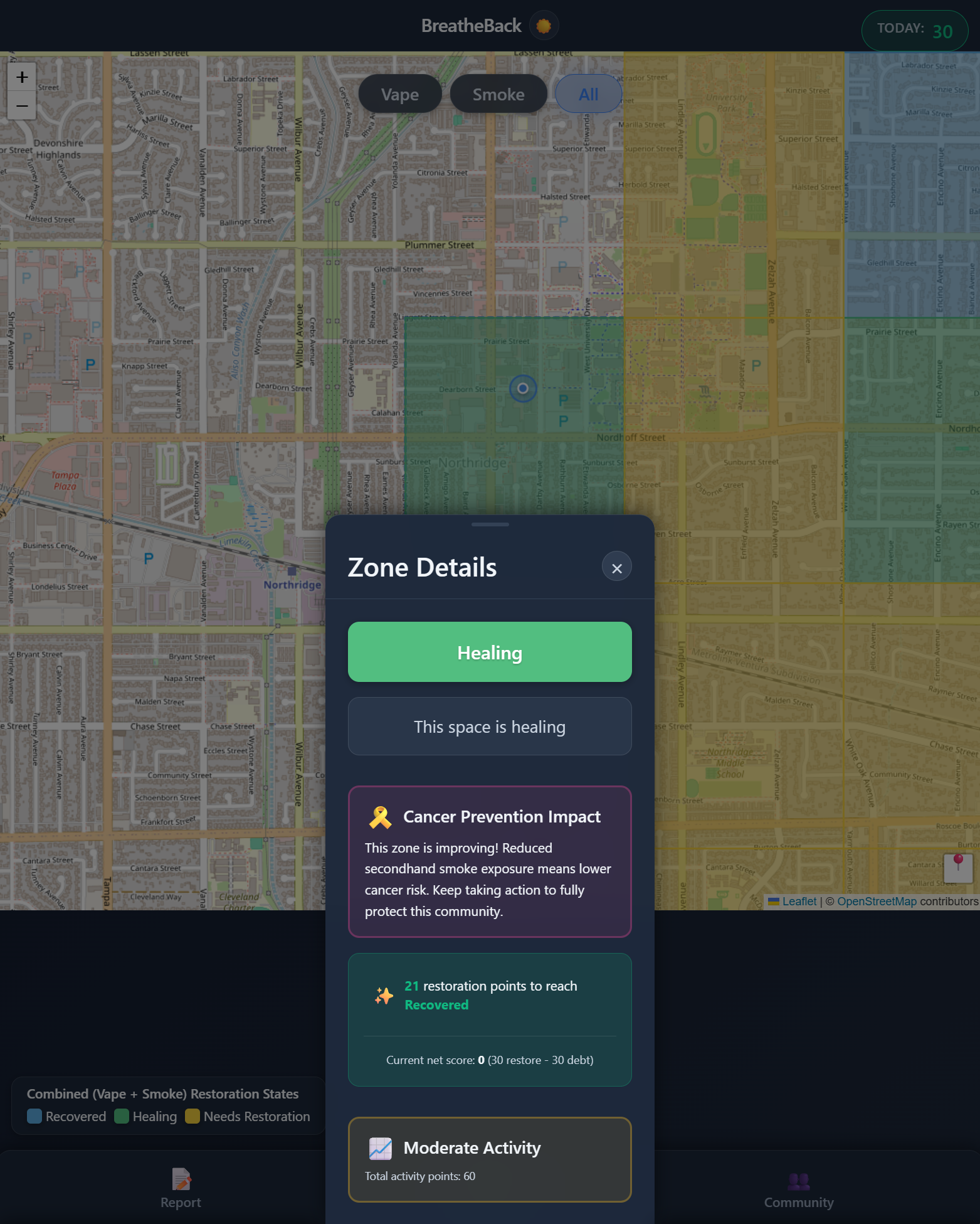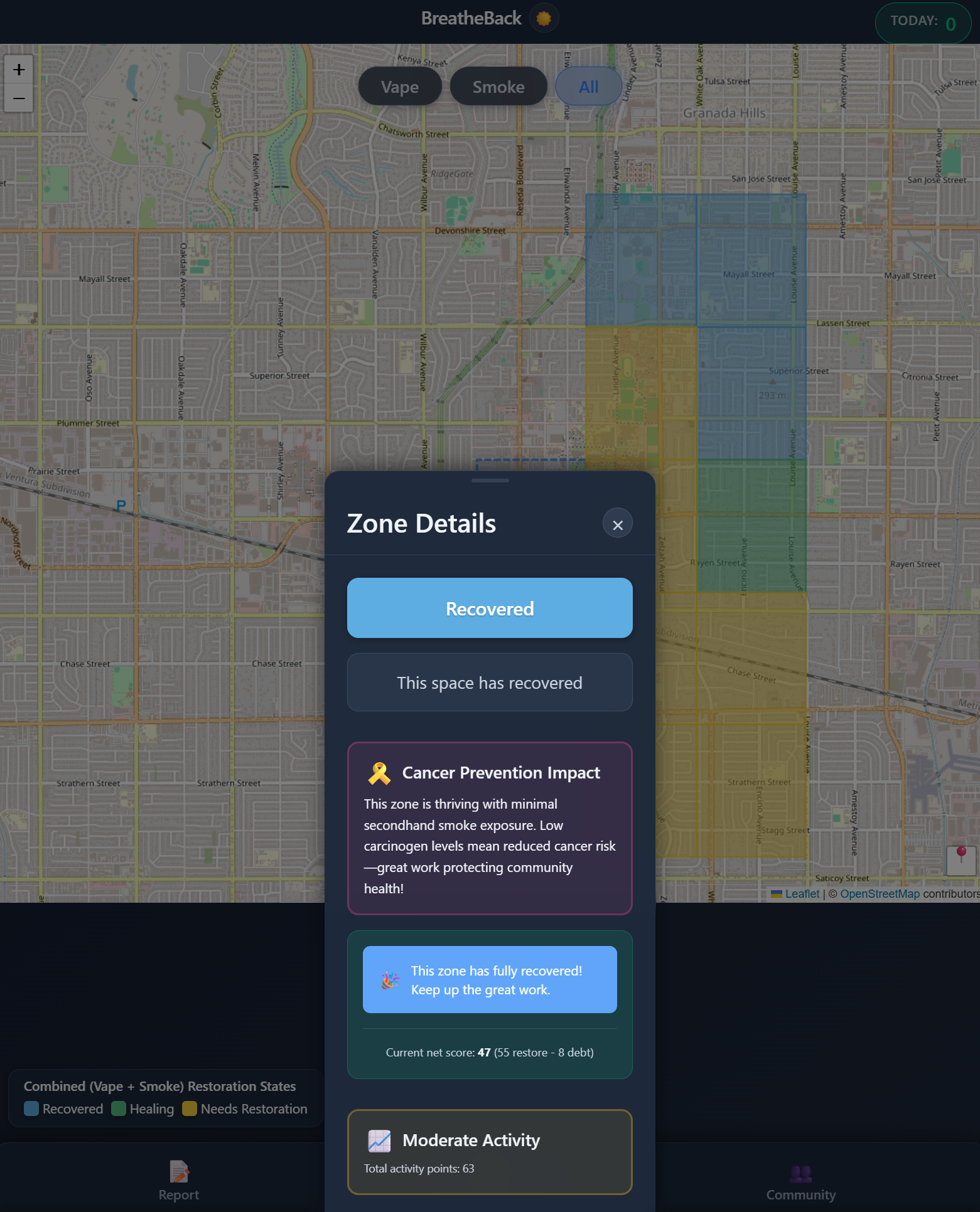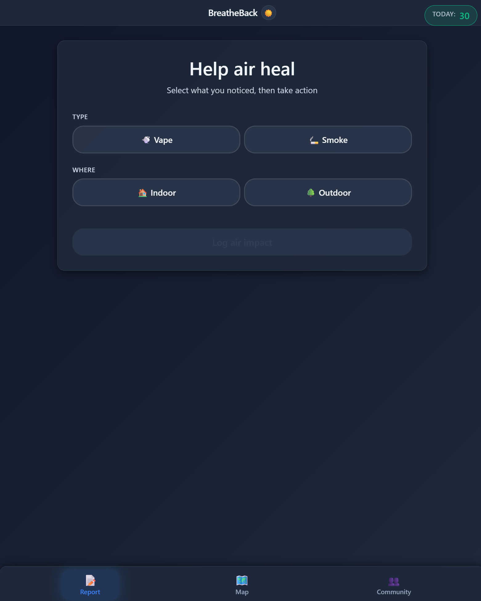 BreatheBack is a mobile-first web app that visualizes community air restoration rather than harm. Users can log smoke or vape exposure they notice in shared environments, without identifying individuals or exact incidents. The world is divided into grid-based zones, and each zone tracks aggregated exposure signals (“debt”) and community actions (“restoration”).