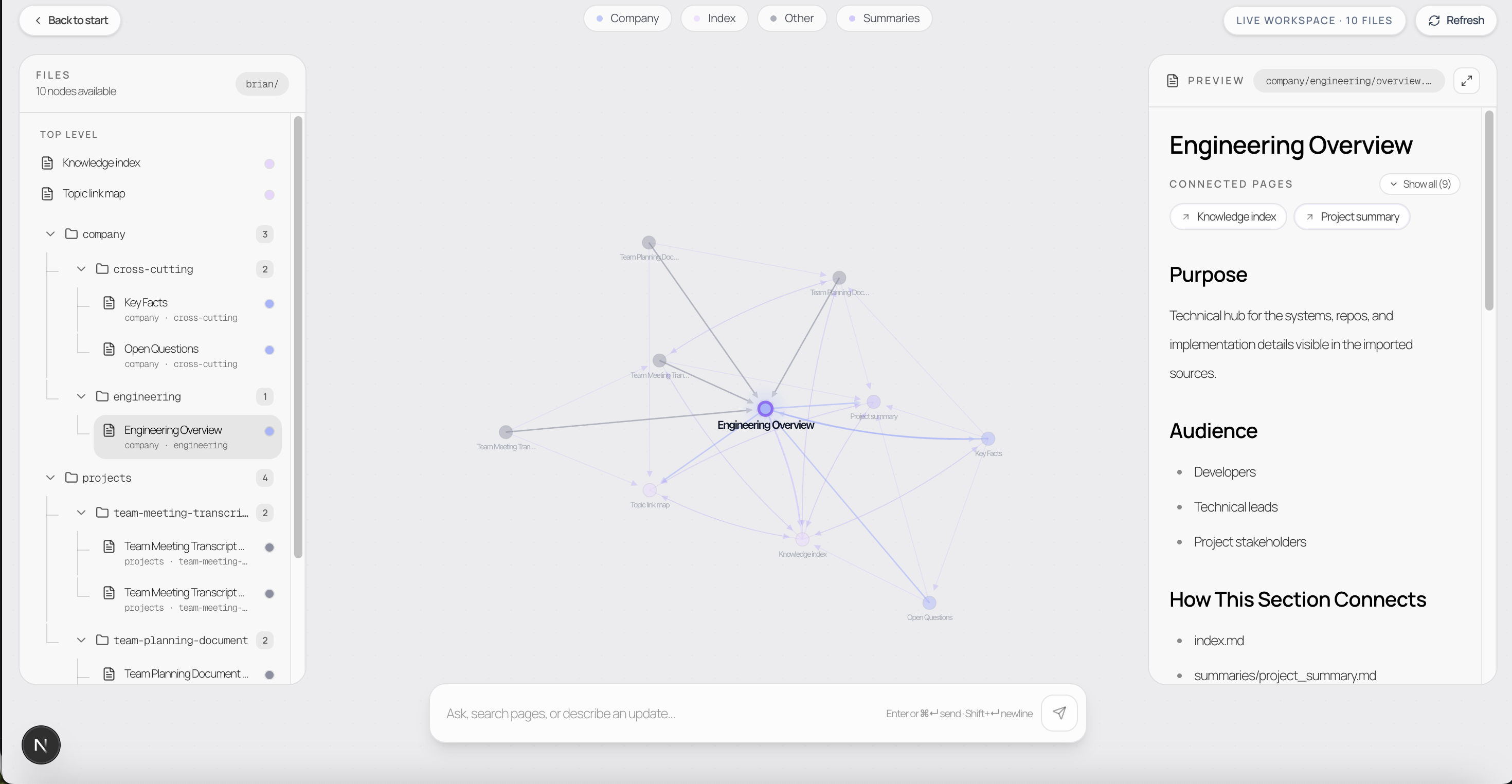 Another challenge was figuring out how much freedom to give the LLM when it builds the brain. At first, we let the model design everything itself including folder names, file names, how documents link to each other. The result was a brain that looks different every single run. The same fact would get filed in a different place/section every time, which made it almost impossible to have some sort of structure. Swinging the other way and hard-coding the structure was another problem, as the brain couldn't grow with new kinds of context. Our solution was a middle ground: we fix the top-level shape (folders like architecture/, decisions/, context/, goals/) and require a consistent metadata header on every file, but the model is free to choose whatever is inside each folder: section titles, filenames, how things link together. This solution gave us a brain that is predictable enough to search reliably while being flexible enough to absorb new topics.