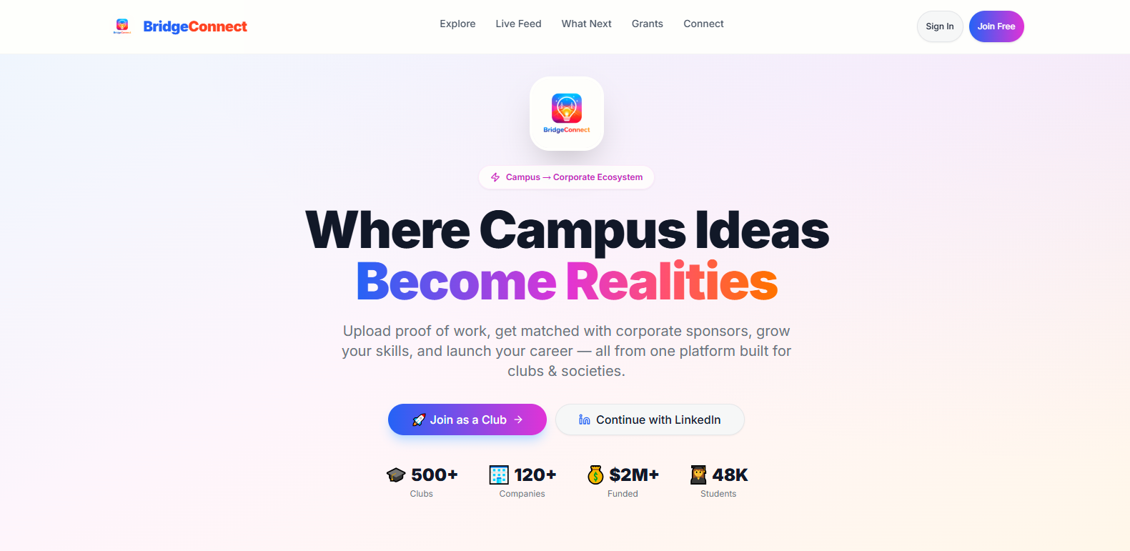 Bridge Connect focuses on connecting student-led clubs with companies, mentors, and organizations.