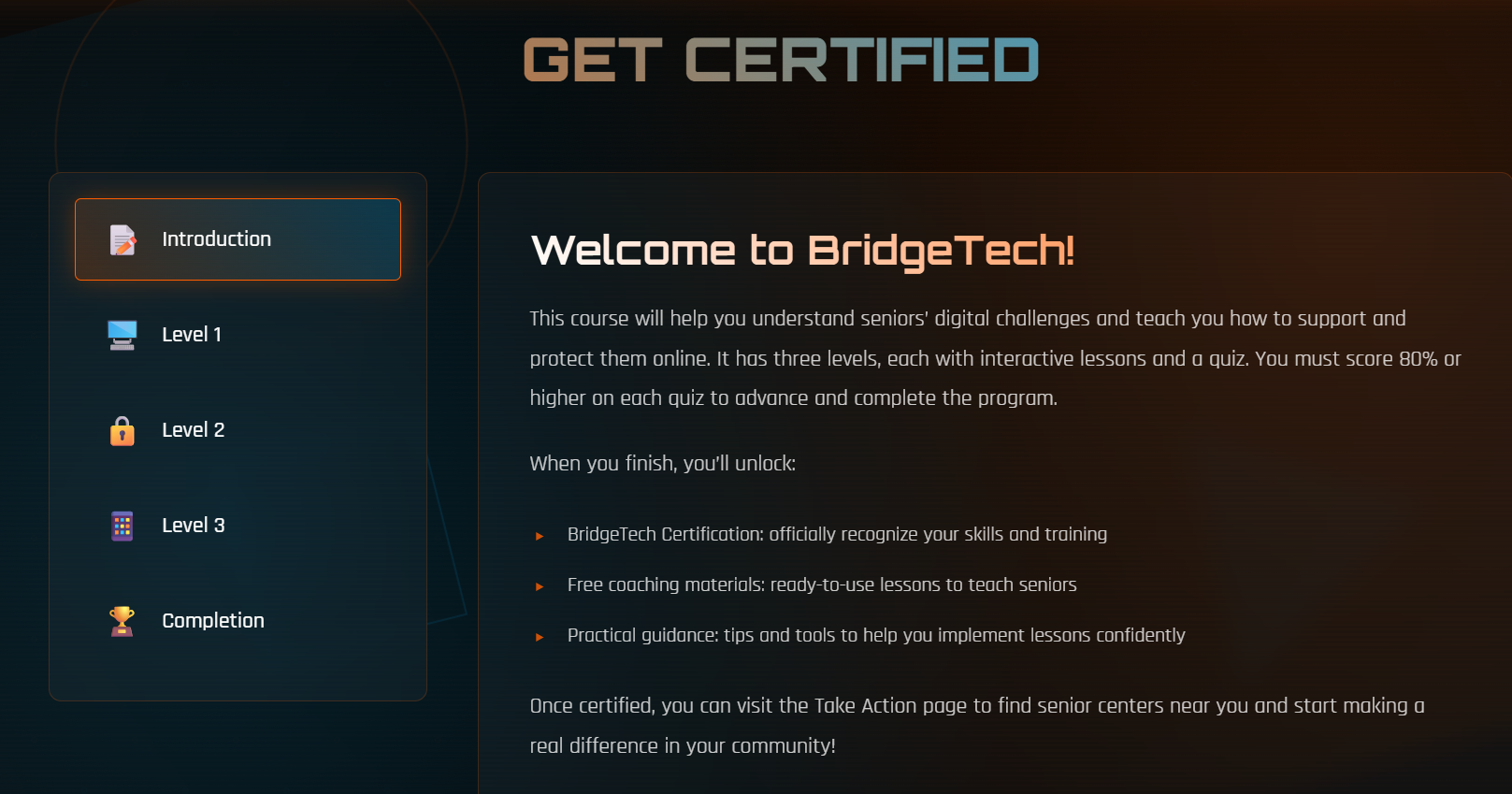 BridgeTech is a web-based platform designed to help students understand digital safety from a senior's perspective. It includes interactive lessons on cybersecurity, scams, smartphone skills, and everyday online risks. Each level has a quiz, and you need to score at least 80% to unlock the next level. After completing all levels, the platform provides a certification, a library of free workshops, and encourages students to use what they learned to support local senior centers or community spaces. The goal is to make learning meaningful by connecting it with real service.