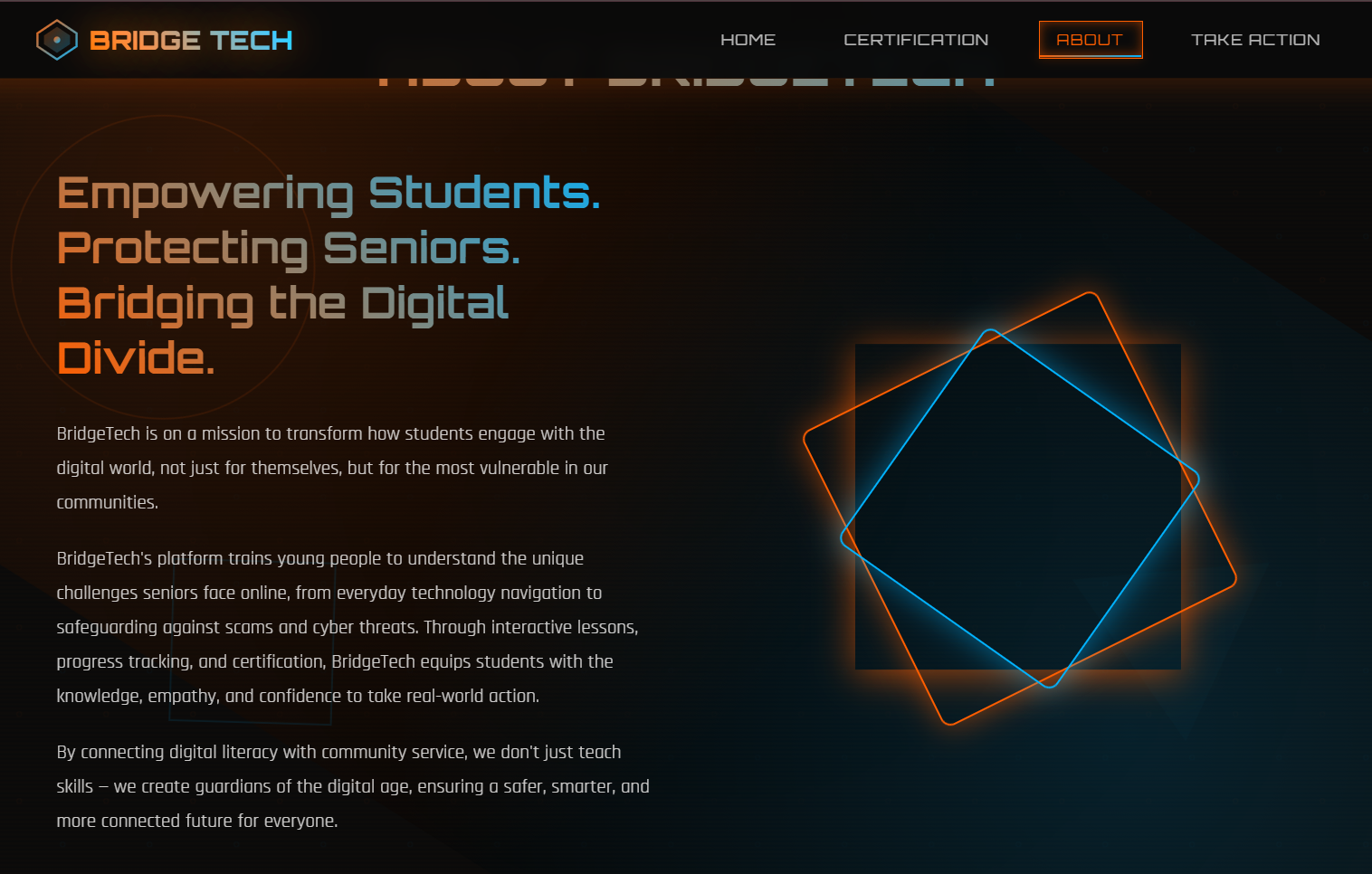 I built BridgeTech using HTML, CSS, and JavaScript. The site is structured into three interactive learning levels followed by a certification step. I used JavaScript to create the quiz system, calculate scores, and lock or unlock levels based on whether the user passes with at least 80%. Progress is saved through localStorage, so users can leave and come back without losing their progress. I also added visual touches like floating particles, glitch style headers, and rotating text elements to make the experience more engaging and futuristic while still keeping it clean and accessible.