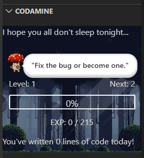 Codamine is a VSCode extension that gamifies the coding experience by giving you XP for each keystroke in a project, tracking the number of lines of code you've written, and summarizing your commit-diffs all while motivating you with a harmless-looking mascot that calls you out in the sidebar.