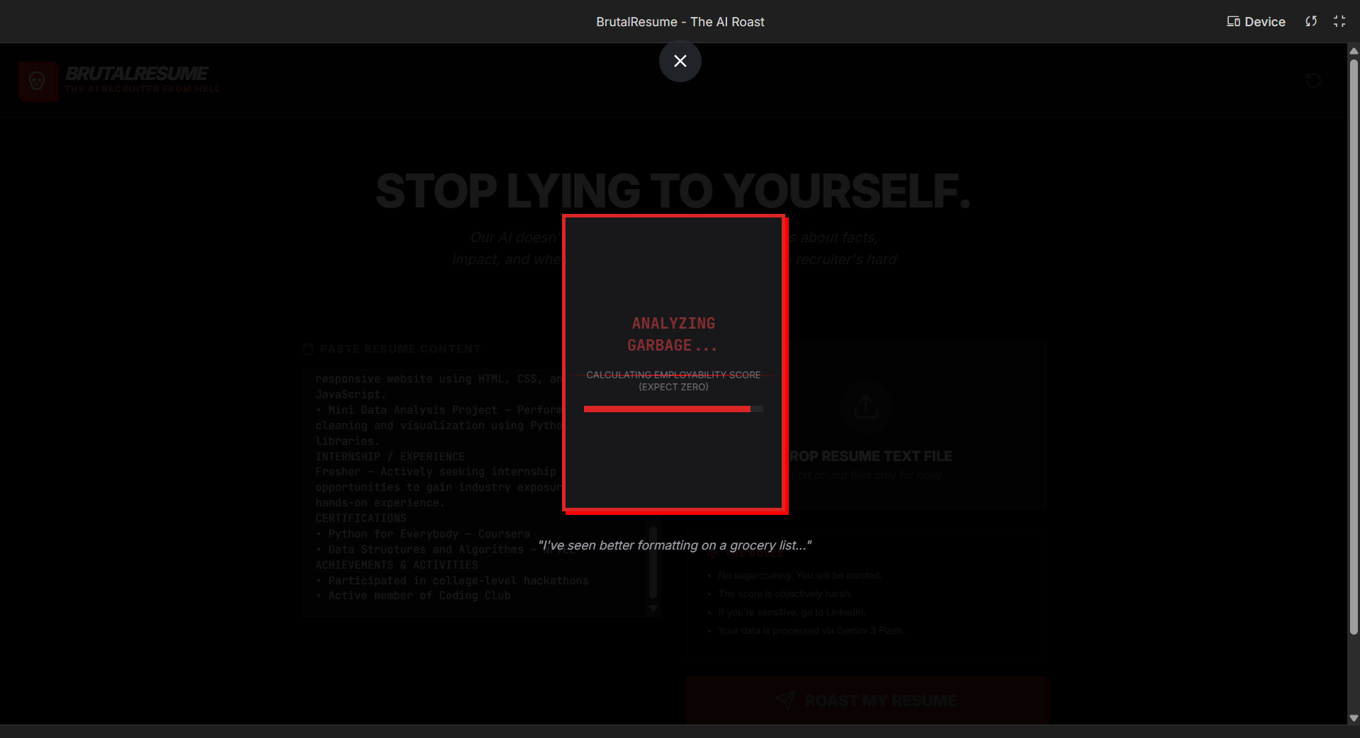 The majority of resume feedback tools are too positive and generic, and this makes it hard for users to understand what specifically is going wrong with their resumes when they apply to a real hiring process. The inspiration for BRUTALRESUME came from the belief that accurate and high-signal feedback is much more valuable than positive feedback to job seekers facing a competitive hiring environment.