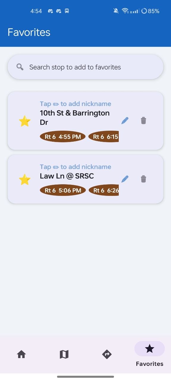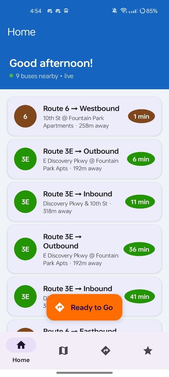 Fare payment integration, trip history, service alerts, and a widget for the home screen showing your next bus at a glance.