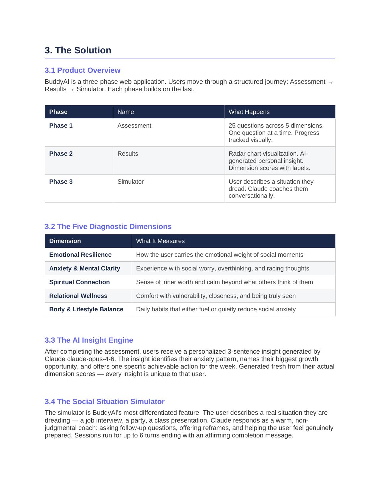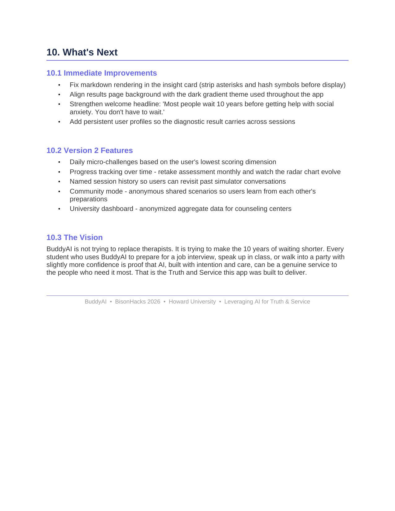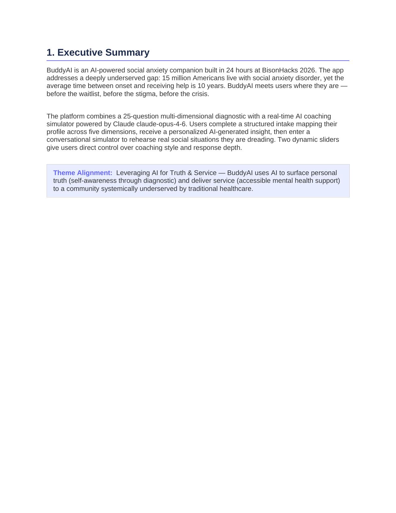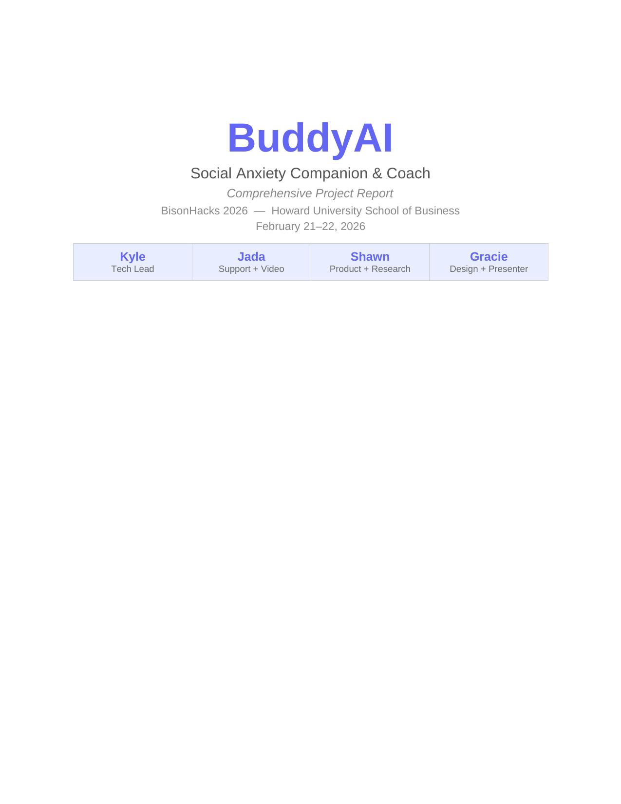 We’ve all been there; in a conversation and you have the perfect thing to say in your brain but out loud you can’t. The question is why. This is because of the “Shrink Response”. In high-stakes environments, social anxiety can turn “Truth” into silence. We built Buddy AI not to give the answers, but to give you the tools. We wanted to build a regulator that helps users claim their space and their voice. Buddy AI is powered by the Claude claude-opus-4-6 Insight Engine, a platform-agnostic diagnostic tool that bridges the gap between mental health crises and action. Detects: Through natural conversation, Buddy monitors the “vibe” of your interaction. It notices patterns like circular thinking, over apologizing, or the “speech rush” that can be signals of confidence dropping. Diagnoses: The engine identifies the specific signature of social stress (e.g., the “Freeze” where you can’t speak, or the “Rush” where you’re trying to get it over with). Intervenes: Buddy provides immediate, actionable tools. Instead of “advice,’’ it gives you grounding cues; reminding you to check your posture, offering a breathing anchor, or prompting a “power statement” to lock you back into the moment. How we built it At its core, Buddy AI is about Service to the self. We believe the greatest “ Truth” is the one under the layers you are scared to be seen. By regulating the physiological response we are serving the individuals who have the ideas to change the world but just need a “Buddy” to help them get the words out.