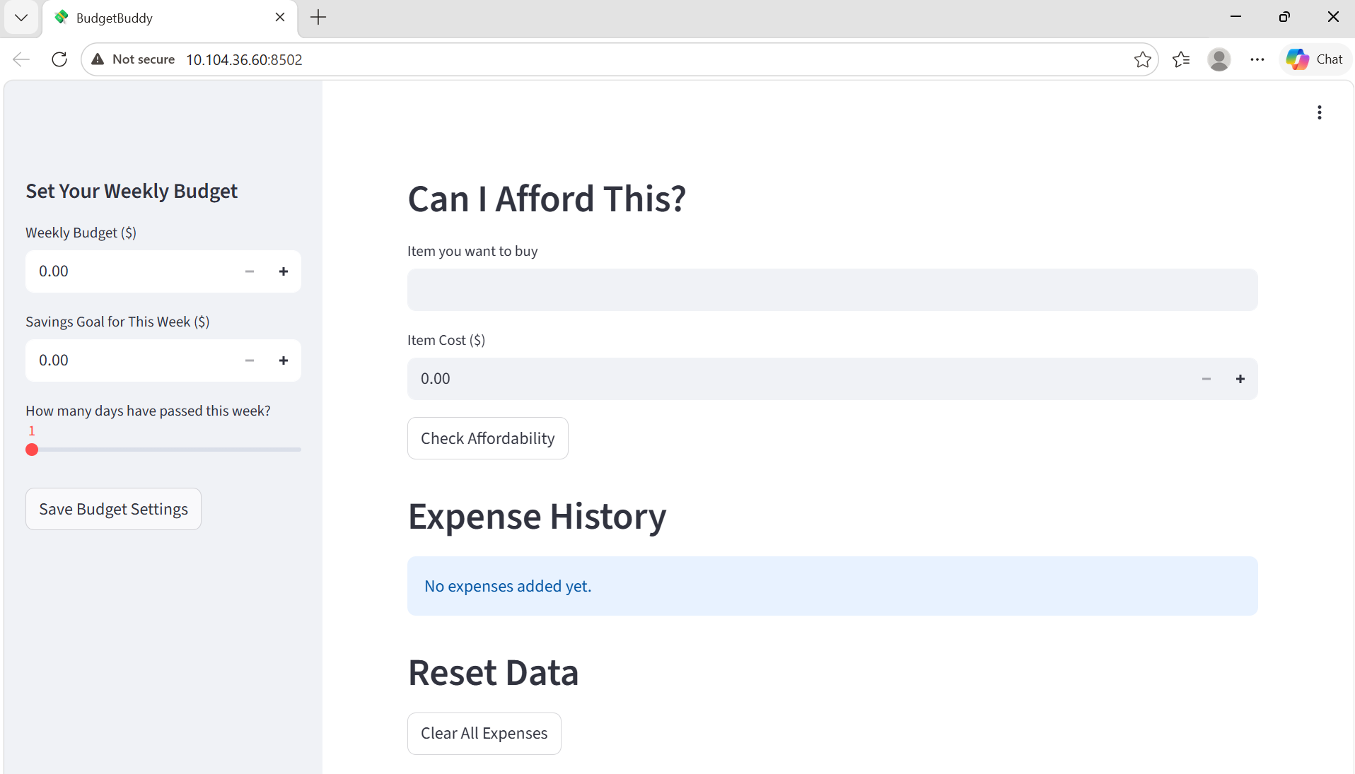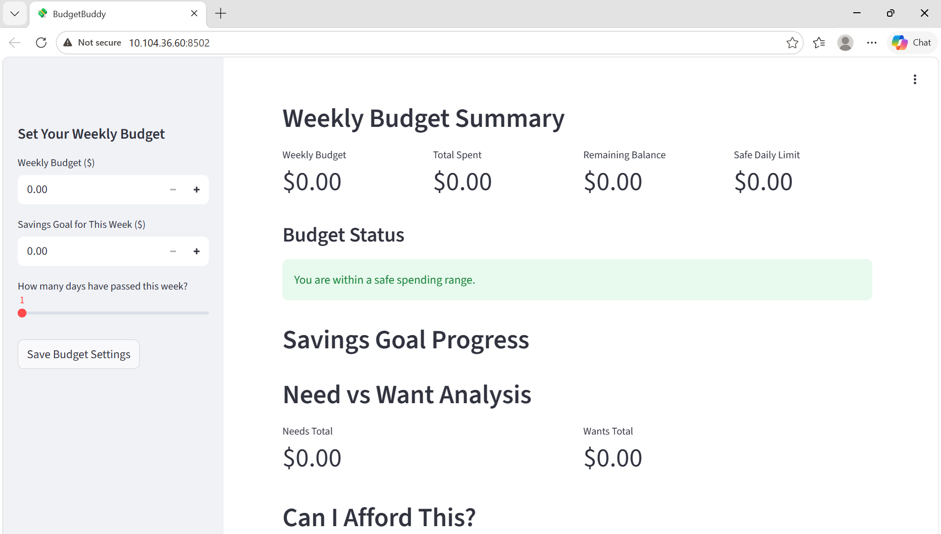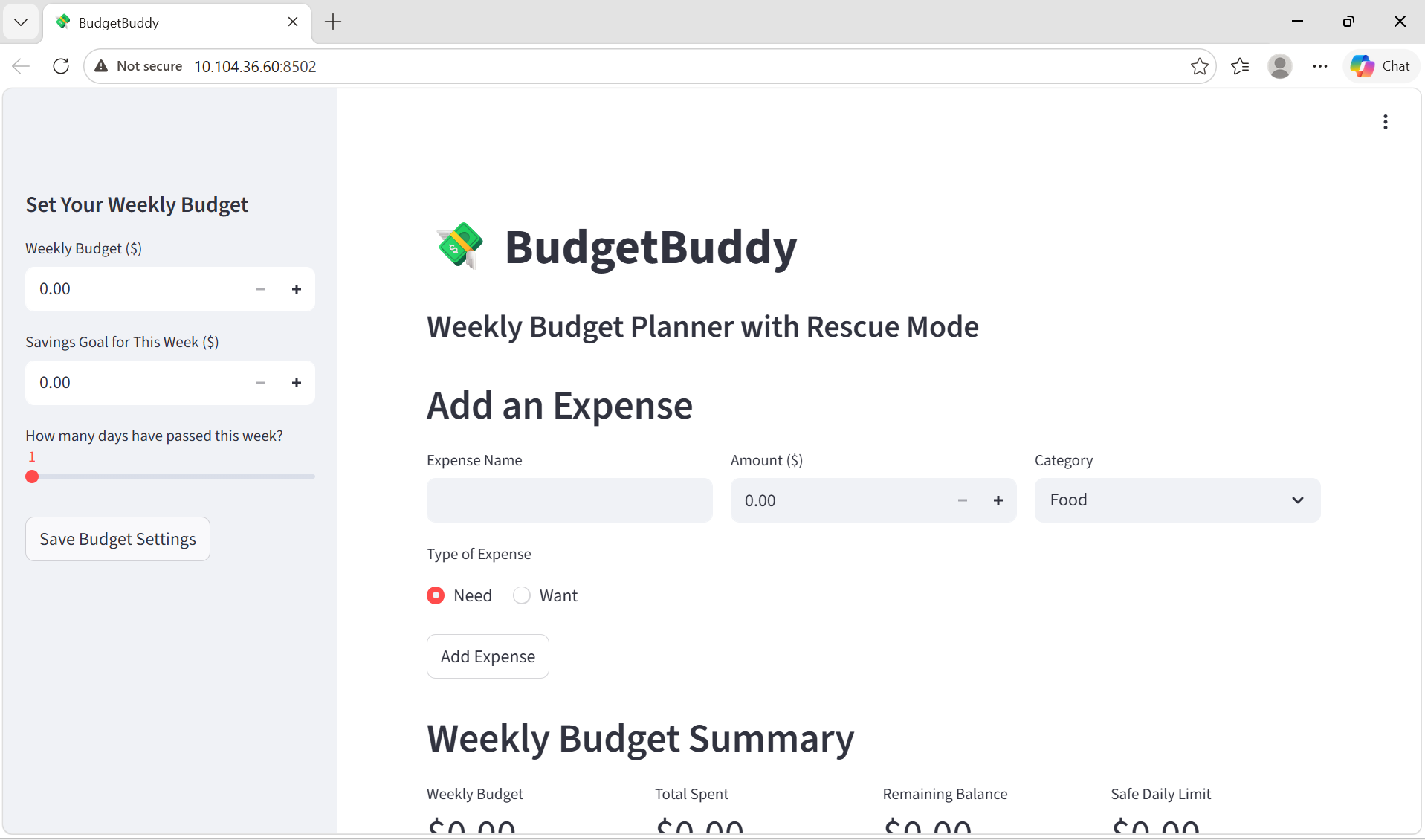 BudgetBuddy is a 'weekly budget planner with a Rescue Mode'. Users can set a weekly budget, enter expenses by category, and instantly view how much they have spent, how much money is left, and how much they can safely spend each day. The unique feature is the "Rescue Mode", which activates when the app detects that the user is close to overspending. It then gives a realistic recovery plan by showing a safe daily spending limit, highlighting high-spending categories, and suggesting where to cut back on non-essential spending.