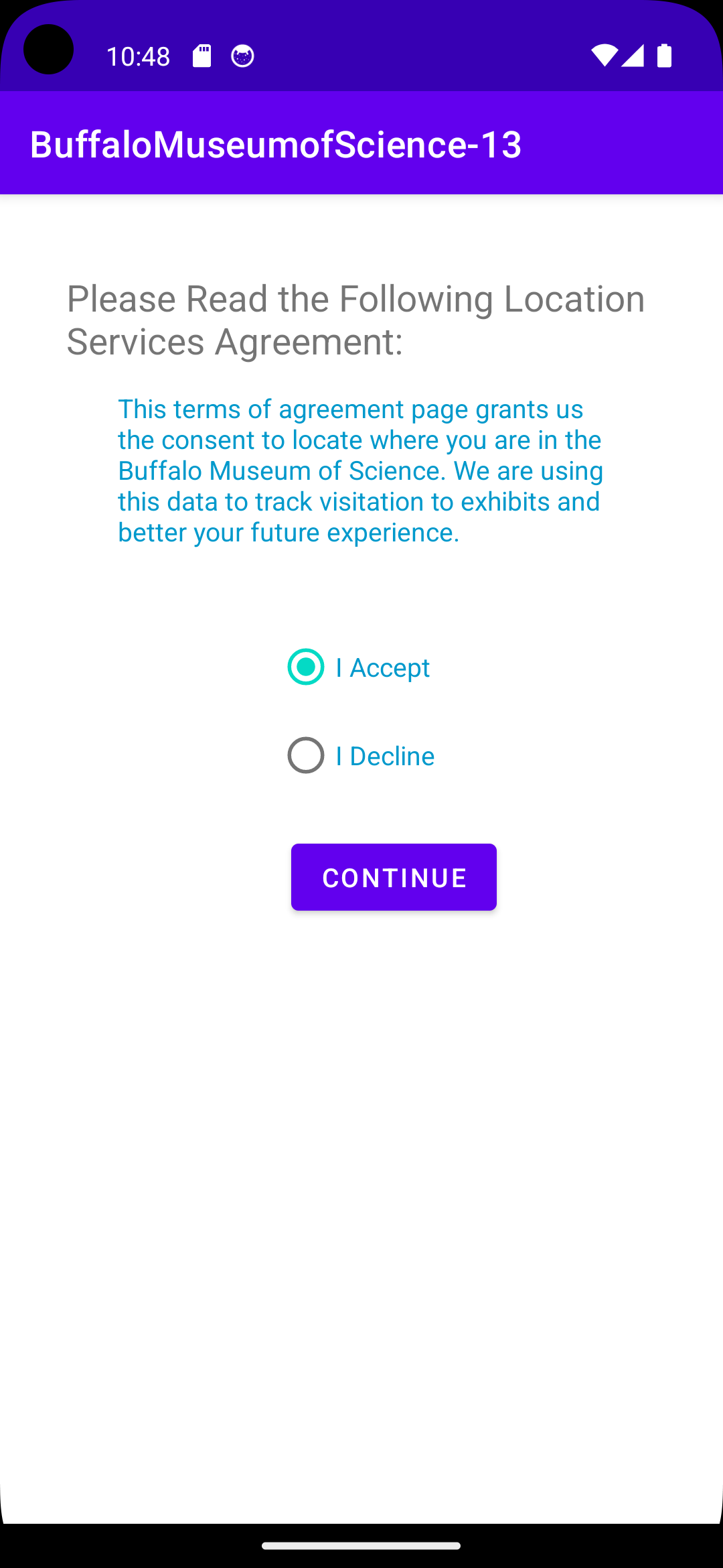 The new Buffalo Museum of Science app is centralized around it's location services. Once the user agrees to the terms, the app with track their location if they are in the museum. This will accomplish many goals like monitoring exhibit traffic, helping to navigate the museum through an interactive map and checking to ensure all visitors have exited the building in case of an emergency.