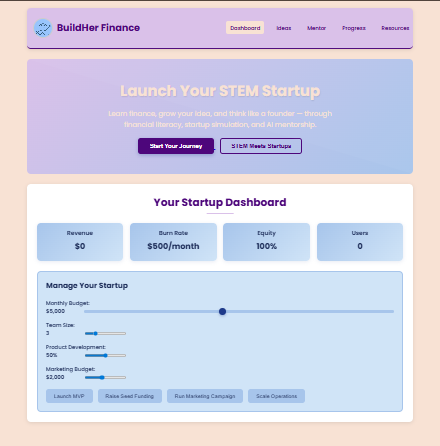 BuildHer Finance is an interactive platform designed to teach personal finance, investing basics, and entrepreneurship — all through a lens that reflects young women’s lived experiences. The platform includes educational modules, smart budgeting tools, startup pitch builders, and even AI-generated feedback that helps users improve their business plans and financial goals. Everything is designed to make finance feel accessible, personalized, and actionable.