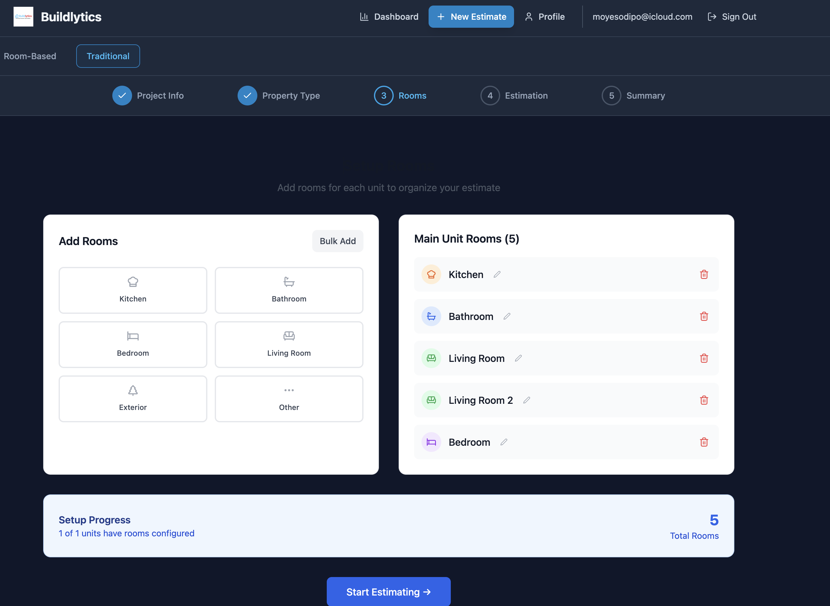 Buildlytics uses AI to suggest material and labor costs room by room, based on your ZIP code. You pick your units and rooms, tweak quantities or costs if you want, watch live totals update, and hit one button to generate a PDF bid—no more spreadsheet headaches.