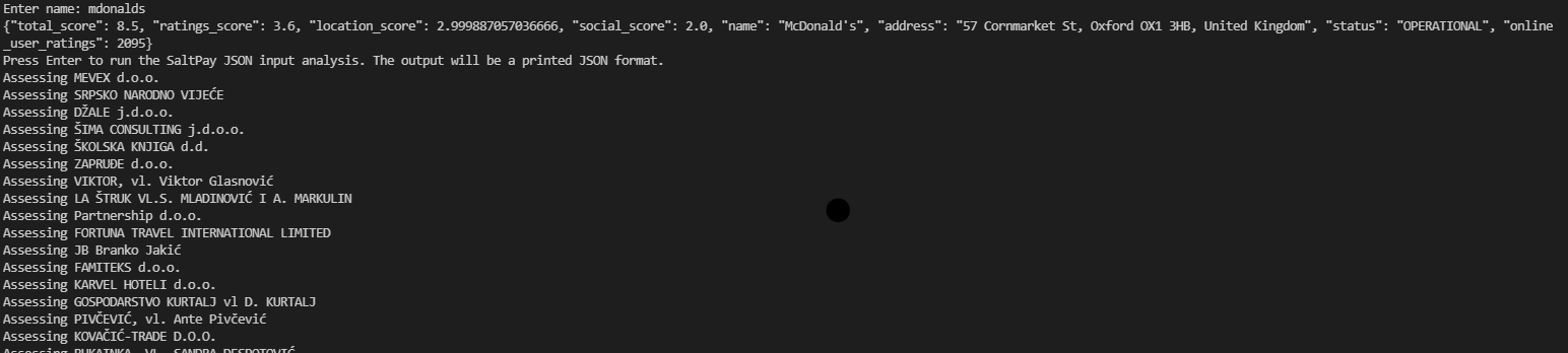 It uses these scores to generate a final total score out of 10 which is displayed to the end-user along with information about the business (such as the name and address) so that the user can be sure that the analysed business was the correct one. If not, they can be more specific with their search.