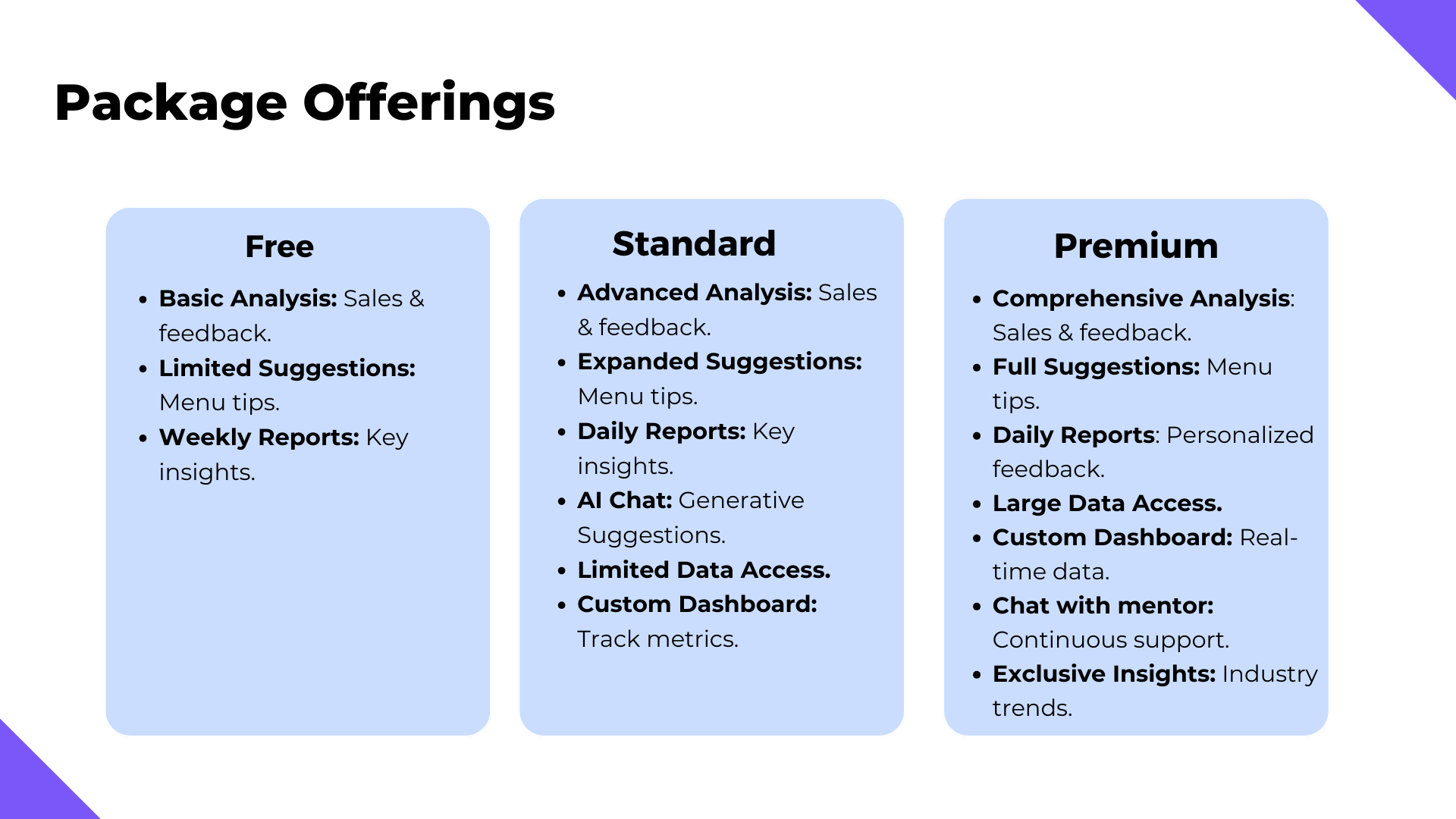 - Standard Plan: Enhanced analysis, expanded suggestions, daily reports, limited data access, custom dashboard, AI chat.