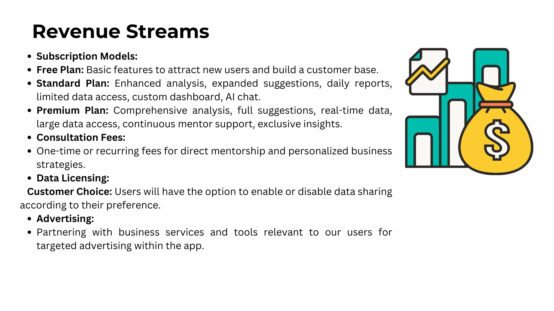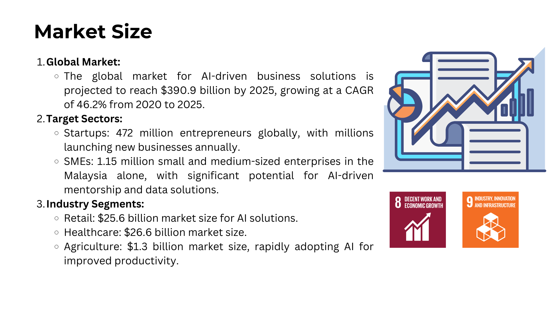 Business Pedia empowers startups by bridging the gap between big data and expert mentorship, delivering tailored, actionable insights and strategies through a scalable, subscription-based model. With a unique combination of AI-driven analytics and personalized guidance, we offer affordable and industry-specific solutions that ensure startups and SMEs stay competitive and innovative. Positioned for significant growth, Business Pedia is set to capture a substantial share of the rapidly expanding market for AI-driven business solutions.