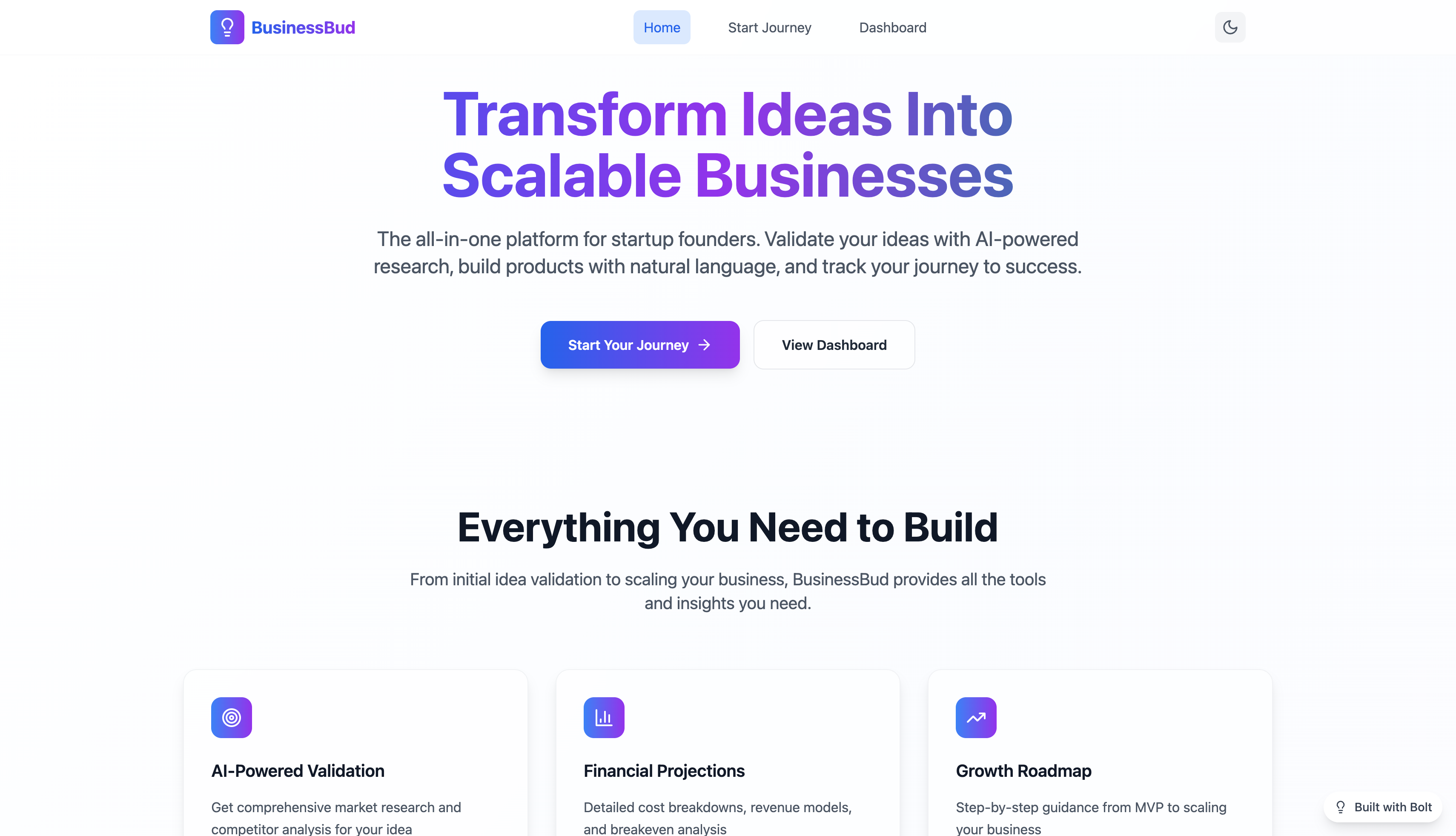 We used Bolt to build BusinessBud from the ground up. The platform was designed with a clean and modern aesthetic, utilizing: