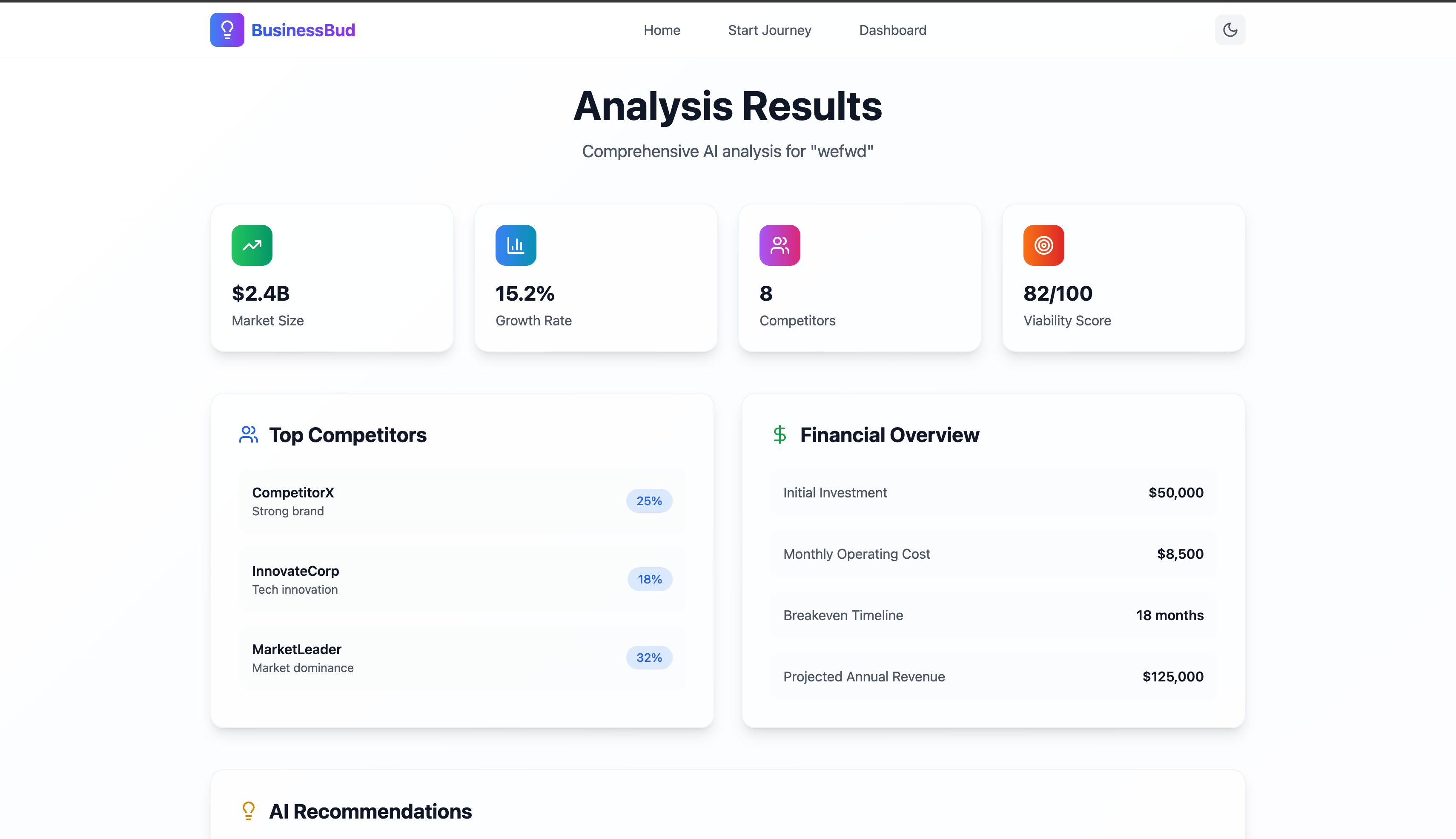 - Submit their idea and receive in-depth AI-generated research including market trends, competitor analysis, projected growth, and financial breakdown.
