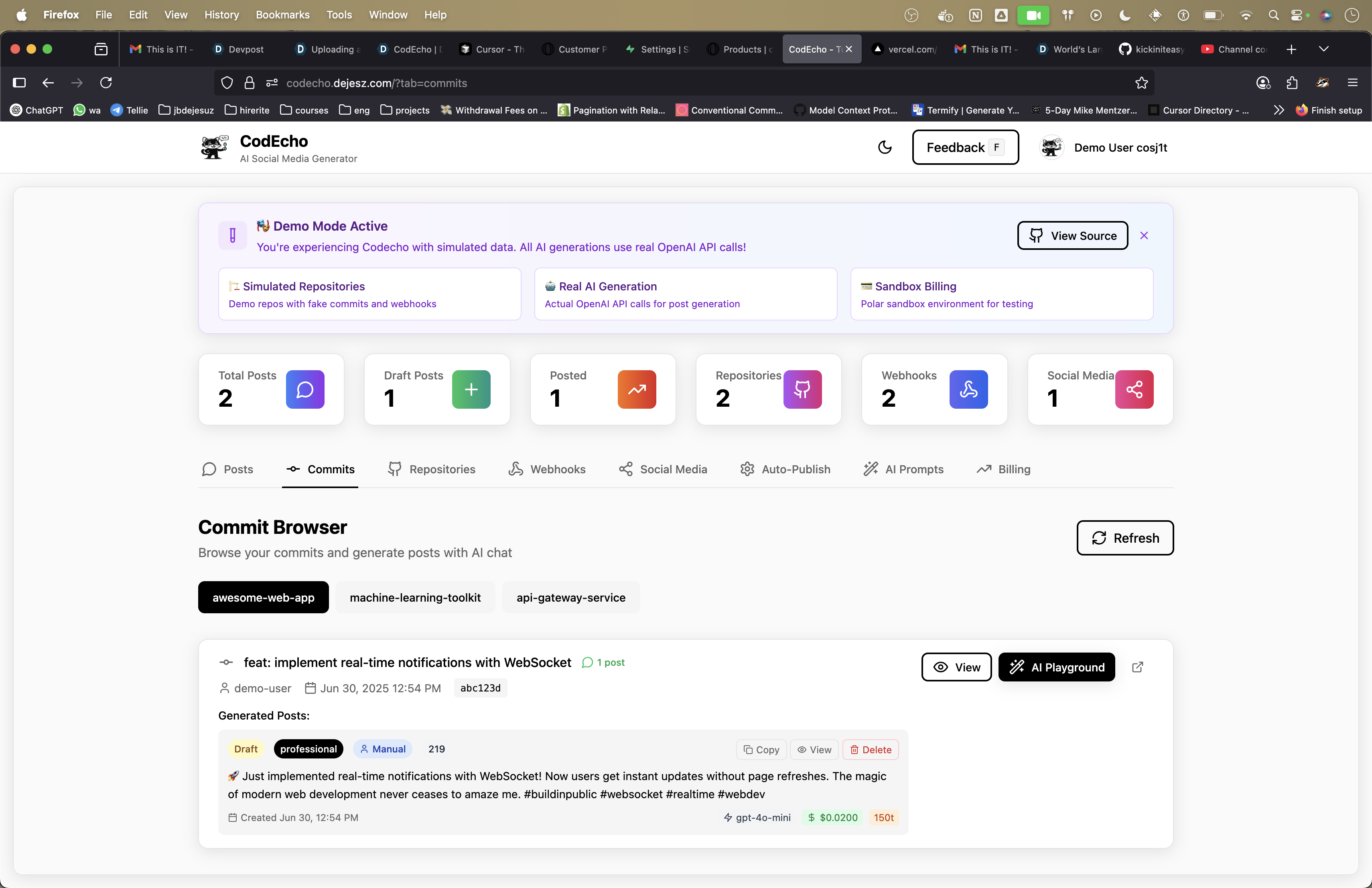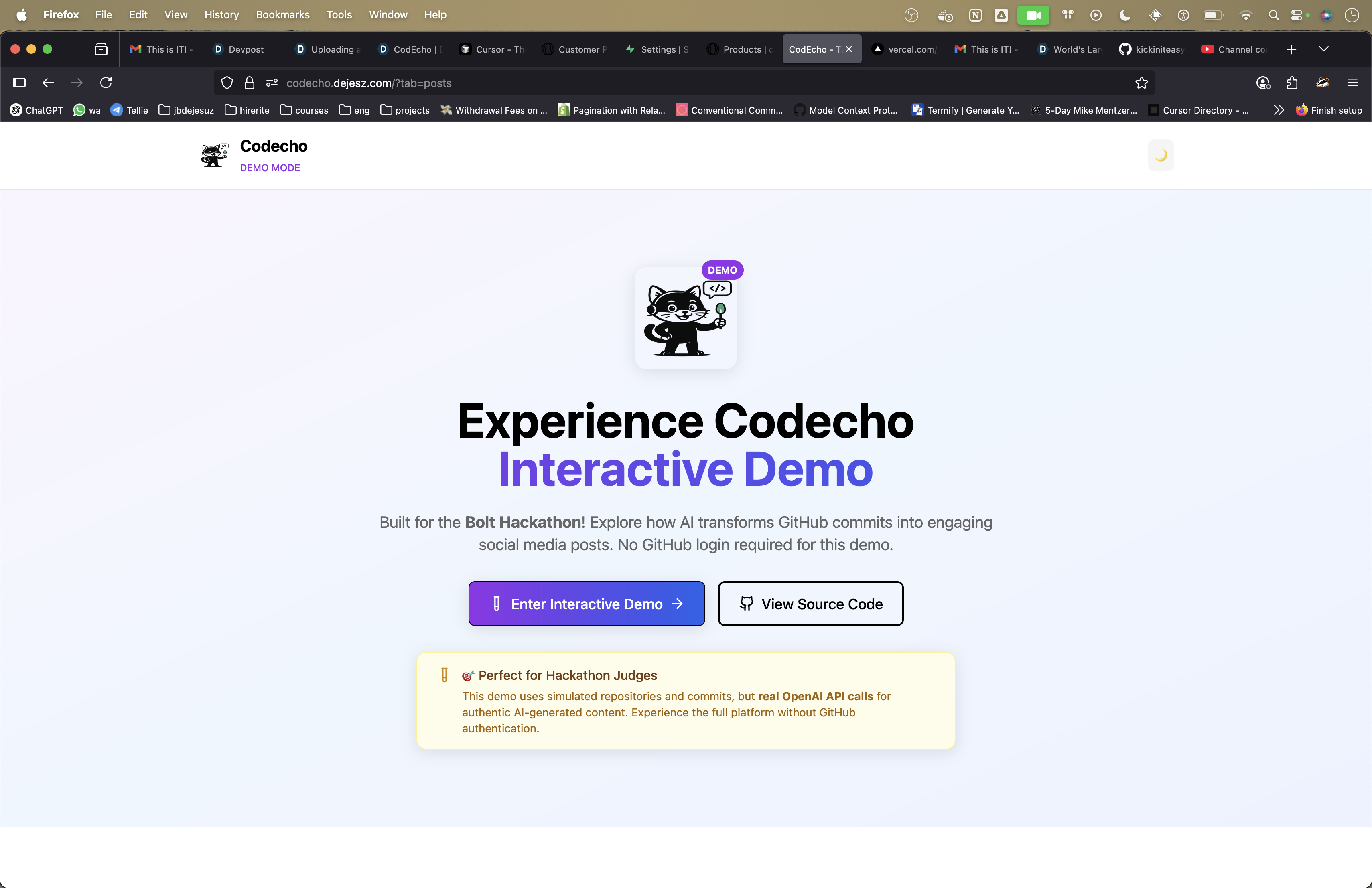I use bolt to start with (even though i hate doing this), over the next 2 weeks I put it effort in the evenings and on the side to further integrate more edge functions and UI functionality. I used supabase as teh backend, and the auth. So supabase allows me to authenticate with github, i then can through this request that i get access to your github repos, once i have that i can pull them, and you can decide which ones to add, once added we'll just pull commits without storing them and then you can take action on these. also, once authenticated i am actually able to create webhooks on your repositories, so i can listen to. whenever there is a new commit, i can just auto generate a post. i used openai with 03-mini, which makes it super affordable to just run for free and output is great. i then also integrated x apis with supabase vault to store sensitive information, and then allowed me to post directly to x.