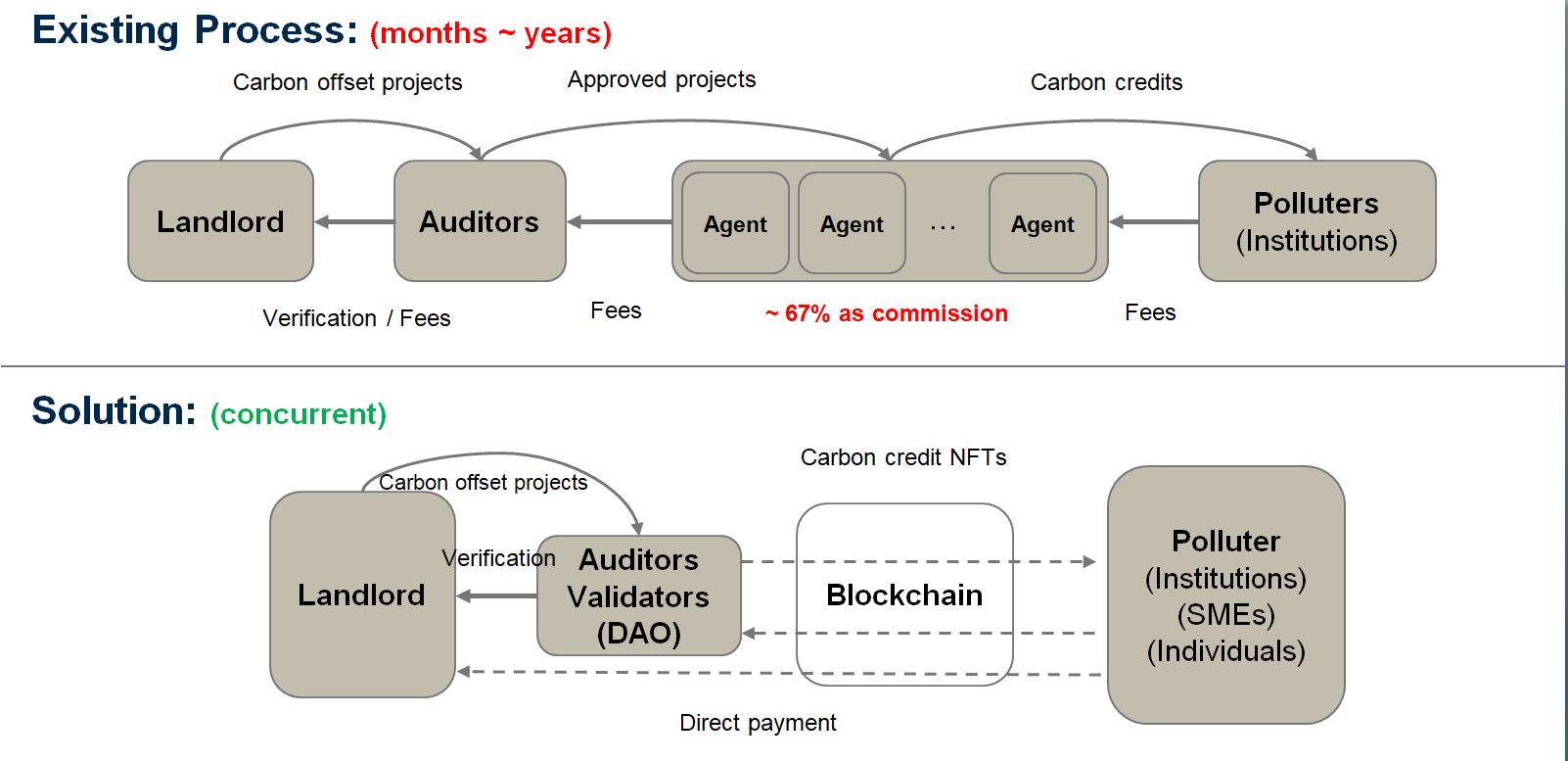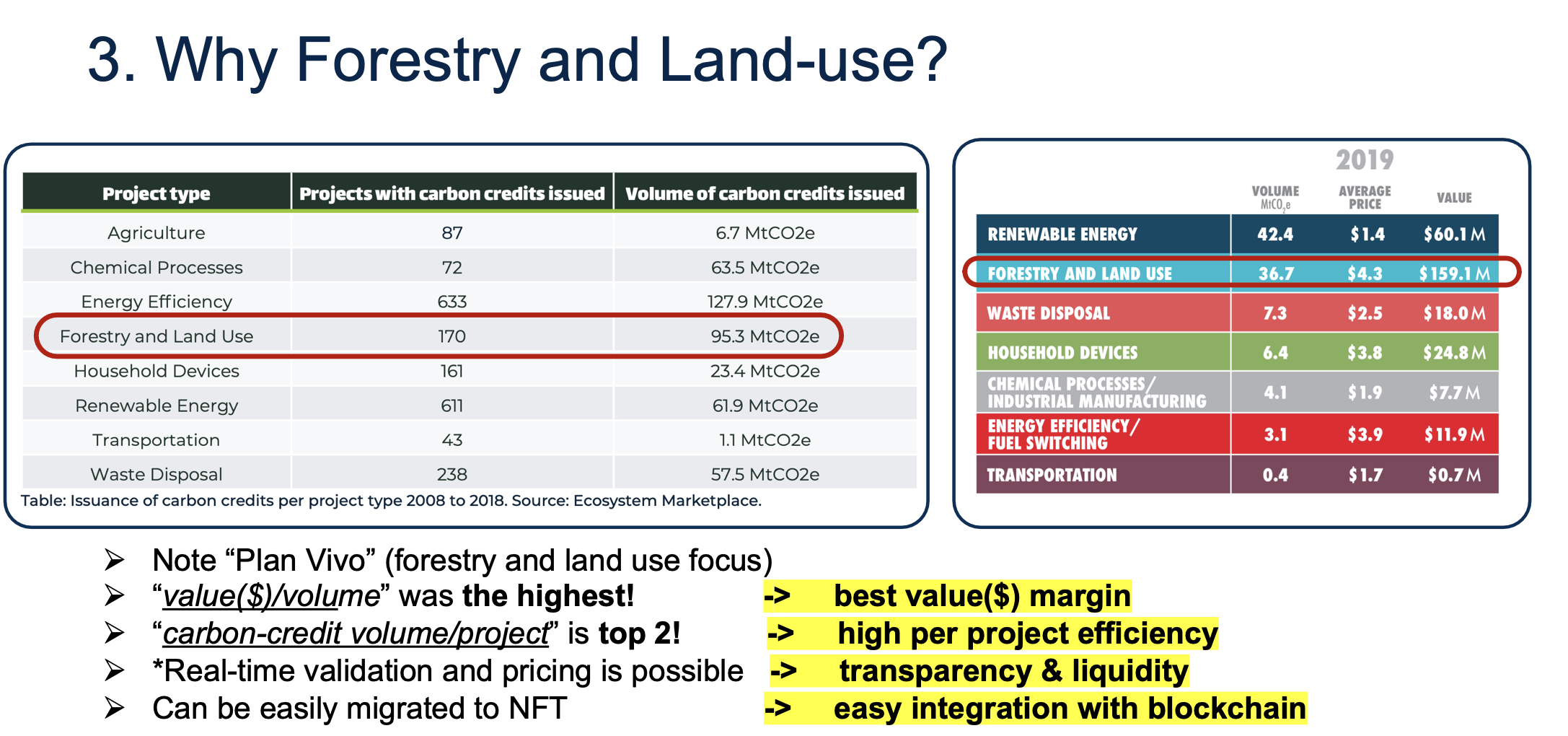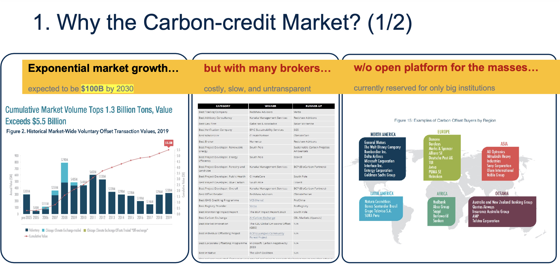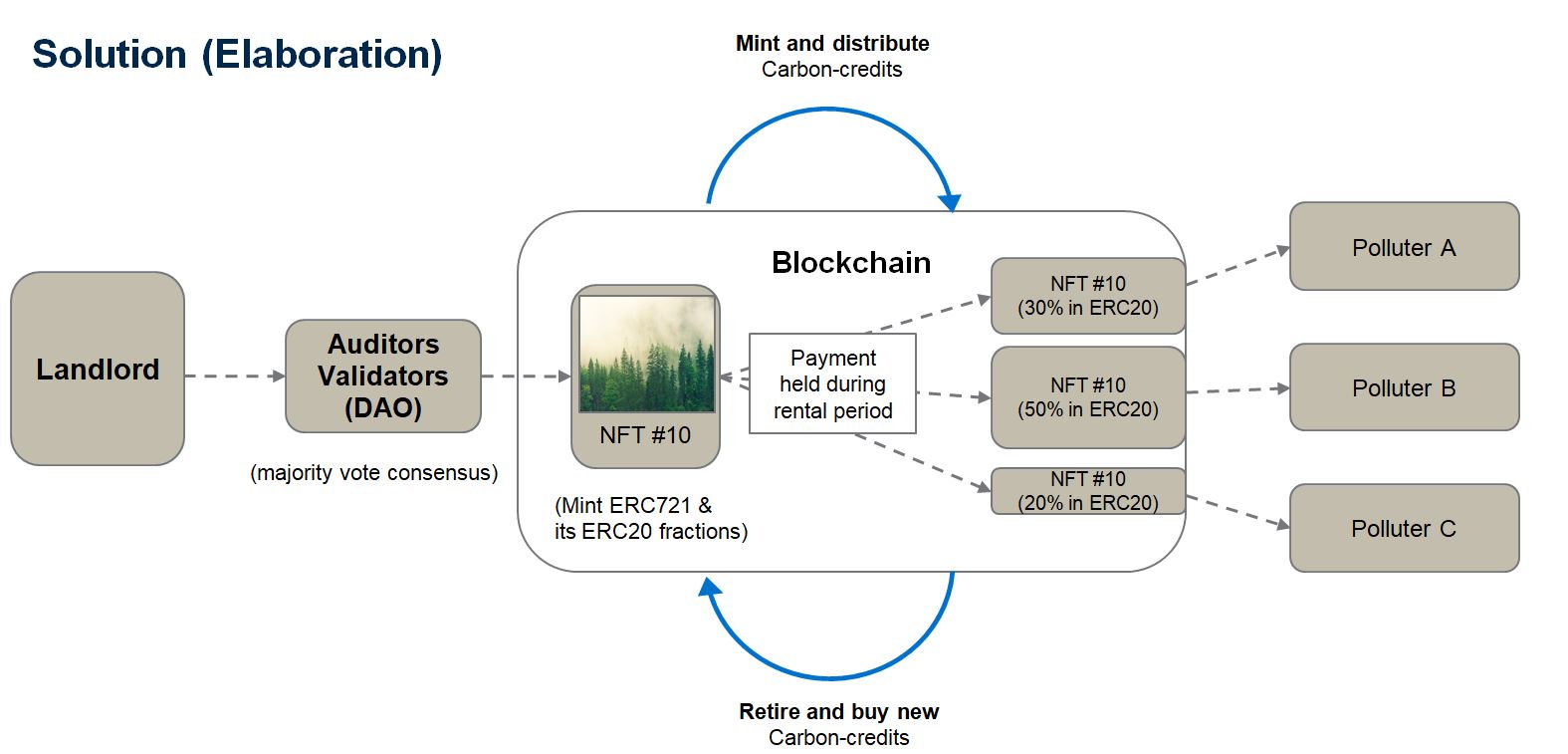 It is a marketplace for NFT-based carbon-credits from forestry and land use projects. Our project is distinct in that it uses NFT fractions which allows for a totally new business model for carbon-credits. Contrary to not only the conventional business model but also newer blockchain solutions out there, our project enables the concurrent production of carbon-credits and their real-time issue/retirement. This will serve as an inflection point for exponential growth in carbon offset speed and in market participation from both the carbon offset project provider end but also the carbon-credit buyer end.
